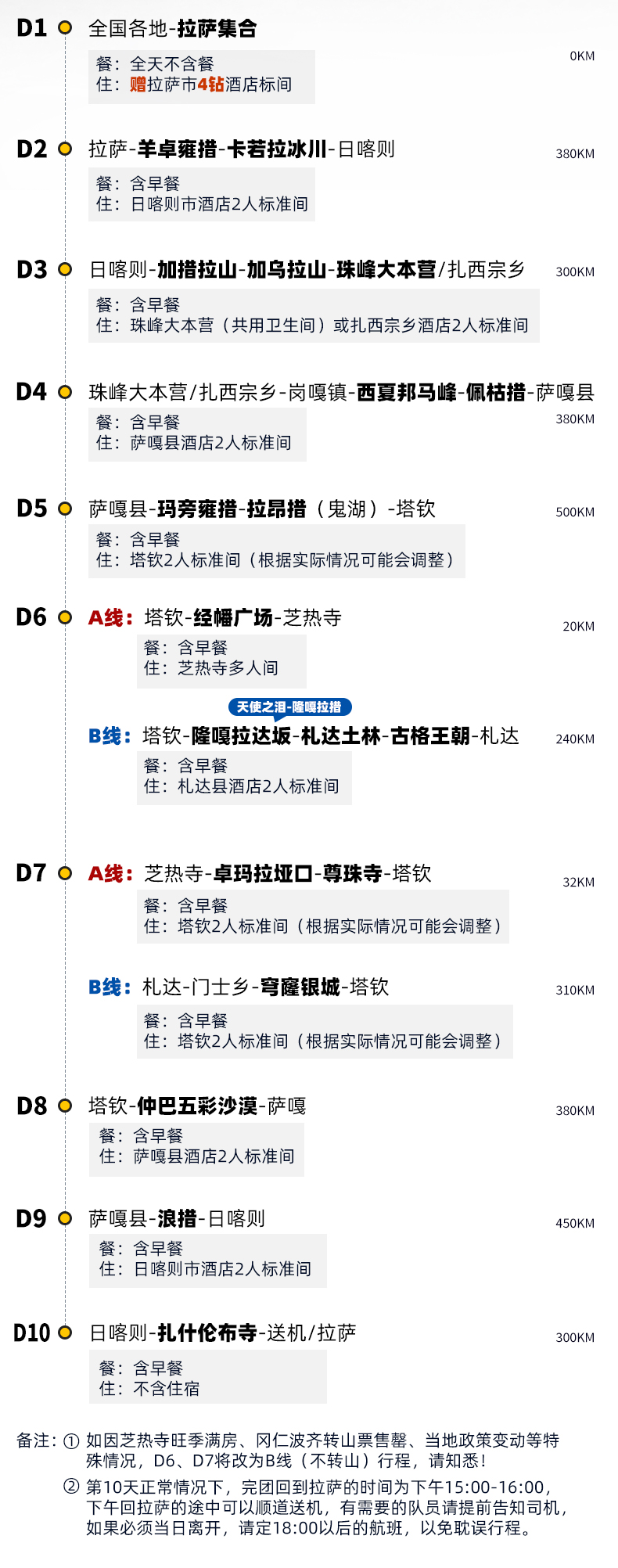 注: (1)以上行程及时间可能会因天气、路况等原因做相应调整,具体以实际出发行程及时间为准。正常情况下完团回到拉萨的时间为下午15:00-16:00,下午回拉萨的途中可以顺道送机,有需要的队员请提前告知司机,如果必须当日离开,请定18:00以后的航班,以免耽误行程。 (2)拉萨散团日当天不含住宿,如需代定,请提前联系客服。