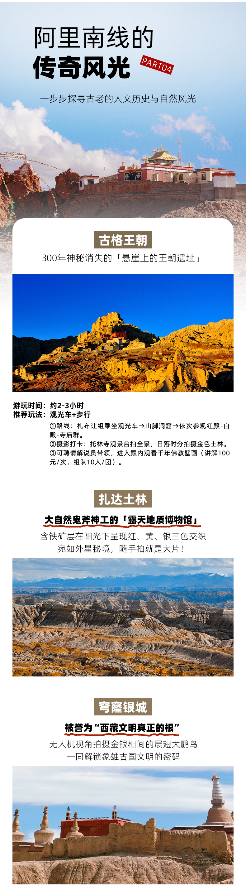 注2: 如不转山,早上用过早餐后,途径札达土林,尤其在清晨第一缕阳光的照耀下,更显突兀神秘,层层叠叠的光影是绝对不可错过的拍摄题材。之后来到【穹窿银城】,这是古象雄文明都城,"琼"是大鹏鸟之意 ,"隆"即"地方","琼隆"也就是大鹏鸟居住的地方。城堡依山而建,两边为王宫,是国王及其家眷居住之地,穿行在穹窿银城仿佛徜徉在充满神秘色彩的象雄王国。在此游玩约2-3小时后驱车离开,今晚前往塔钦入住。