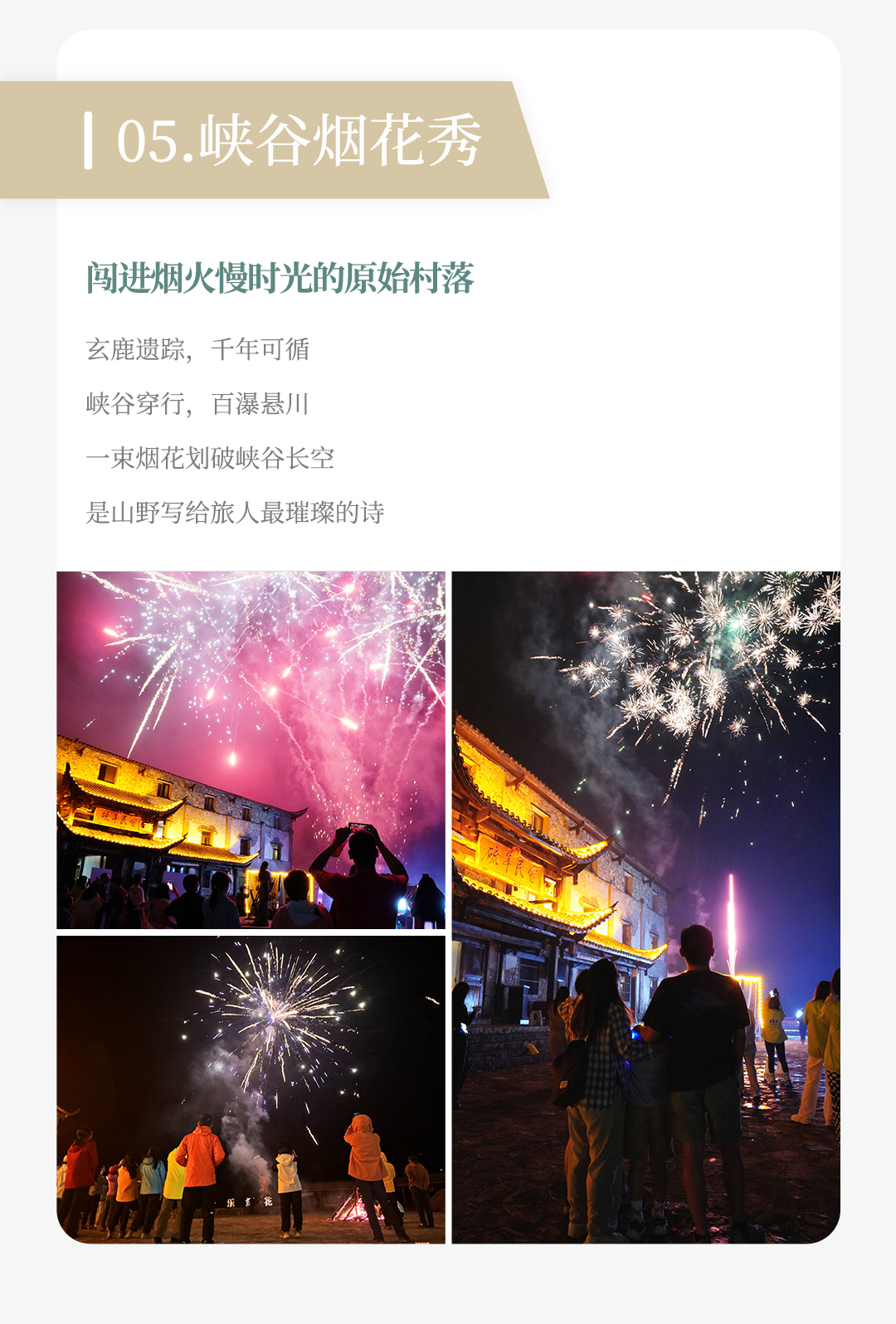 D4:恩施 - 腾龙洞 -云端下午茶歇 - 烟花秀 - 鹿院坪全天 容积世界di一的洞穴秘境,集齐水洞、旱洞等七大景观,堪称 “中国洞穴天花板”!时间赶巧,洞内还能看到土家实景歌舞《夷水丽川》,天然溶洞剧场 + 顶级舞美,边赏奇景边品民族风情。 洞内常年恒温14-18℃,简直是避暑天堂!一路走一路拍,巨大的空间感让人显得渺小,每一步都是景。暗河奔流的声音在深处回响,神秘感拉满。 青山不语,茶香氤氲。静坐此间,听鸟鸣山幽,任烦恼随风远去。 这场藏在山川怀抱里的景观下午茶,可细品精致茶点,尽赏万米绝壁长廊云雾缭绕的壮阔,邂逅 “清江升白云” 的奇景。亲子、闺蜜、家人打卡拍照,定格云端惬意时光。 举碗、祈福、一饮而尽!“哐当” 一声脆响。 摔出的是千年土家的山野豪情,暖的是胃,更暖的是心。 这一习俗源自恩施土家族古老传统,是祭祀祈福、节庆宴饮等重要场合的待客礼俗。酒尽碗碎,以清脆声响昭显诚意,以洒脱姿态传递勇气,藏着土家人淳朴热烈的处世之道。 温馨提示:美酒虽好,切勿贪杯,适量饮用才能尽享这份传承千年的山野快意! 一束烟花骤然升空,划破鹿院坪峡谷的静谧长空。星火倾泻而下,与漫天星光交相辉映,点亮整片山野。 这一瞬的璀璨绽放,是峡谷写给旅人最浪漫的诗行,也是藏在秘境里的限定惊喜。 (温馨小提示:该景区交通有限,仅携带1日换洗衣物下山即可!如遇旺季民宿无房,将调整至大峡谷附近同级民宿&酒店入住~)