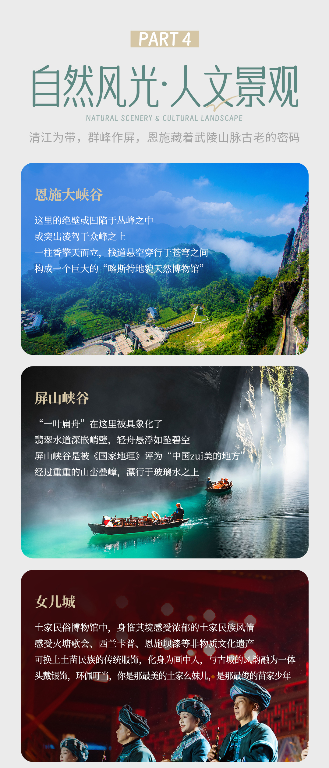 D2:恩施 - 屏山峡谷 - 仙山贡水 - 恩施全天 上午奔赴 4A 级景区,这片被誉为“东方仙本那”的奇境,形成于第四纪冰川时期,集奇、秀、险于一身。沿步道下行至峡谷河畔,移步换景间尽览自然野趣。百余丈深的峡谷里,溪水碧蓝澄澈,通透见底。 晴日里,阳光折射水面,泛舟其上如凌空悬浮,仙气飘飘;雨天时,谷内温差催生薄雾,云雾缭绕间,宛若闯入缥缈仙境。 尽兴游玩后,乘大船顺峡谷穿行返程,沿途风光依旧惊艳,千万别眨眼,错过每一处心动瞬间! 暮色降临,泛舟贡水河畔,边享晚餐边赏宣恩夜景。餐后可自由漫步河畔,沉浸式感受小城的宁静与烟火交织的独特韵味。 注:如遇旺季期间用餐船只资源紧张,届时将灵活替换为宣恩特色烤活鱼晚餐,地道风味敬请品鉴。 这座浪漫小城,一河两岸灯火璀璨,半城烟火半城仙。拥有国内最长的音乐跑泉灵动跳跃,恰似仙女遗落的丝带在空中翩跹。