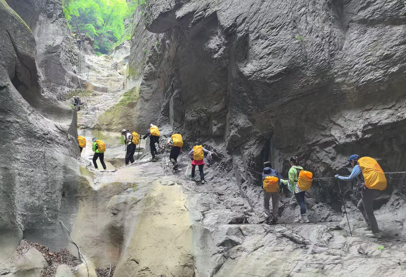 “一线天”是一段非常狭窄的幽谷,有三个断崖,总落差有三十米。第一个断崖不是很陡,峡谷的右侧有一排插入岩石中的螺纹钢,上面拴着铁链,借助铁链,可以下去。下去后,前面是一个潭,中央有一块大石头,潭水不是很深,需脱鞋淌水过去。