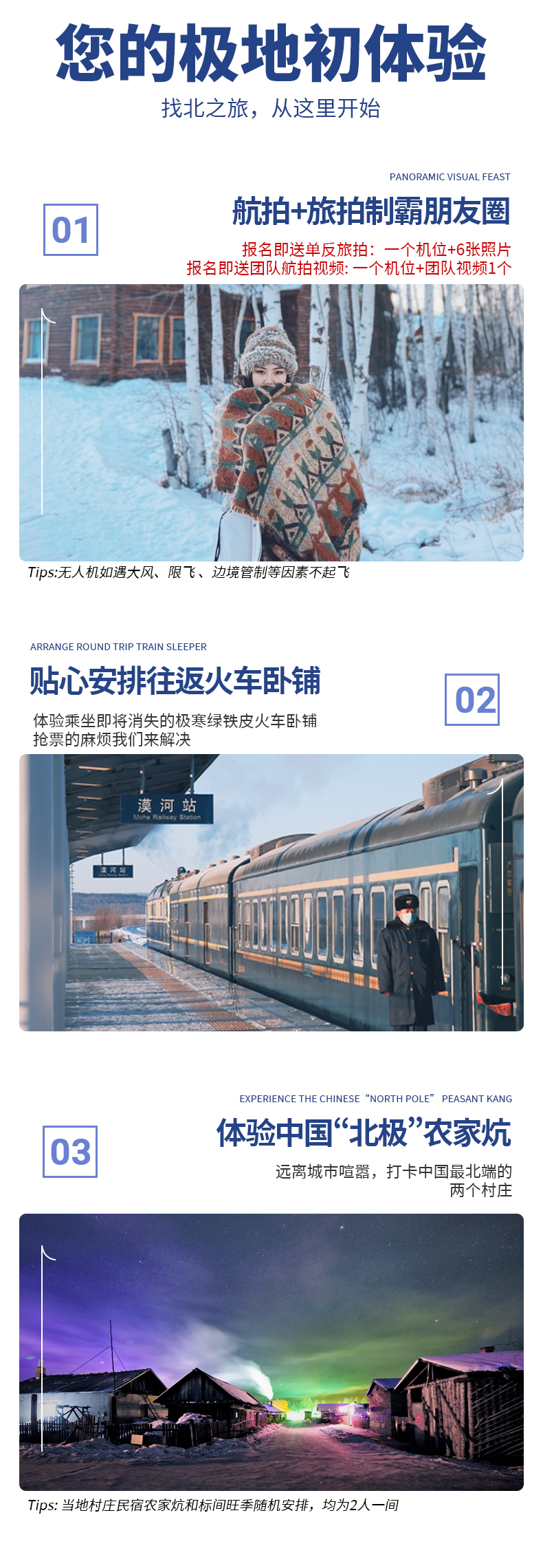 D2:漠河-白桦林雪地轻徒步-龙江第一湾-乌苏里浅滩-北红村-东北特色农家菜-包饺子体验-水煮黄桃罐头-冻梨拼盘全天 08 : 00一觉醒来即将到达,小伙伴们可以看看车外的冰雪风景,大家在车上自行用早餐; 09:30我们先前往白桦林,这里不是景区,所以我们在这里可以尽情撒欢,我们在这里进行一个2km左右的轻徒步。漫步在白桦林中,玩雪撒欢,好不快活。 11 : 30适时中午用餐,大家可以自由用餐或者AA。 13:30抵达游览【龙江第一湾】观黑龙江最大的Ω形江湾,观我国的最北点-【乌苏里浅滩】。 16:30抵达中国最北的原始村庄-【北红村】,这里开发相对没有那么成熟,因此保留了一些原始淳朴的东北边境村庄该有的样子;北红村坐落于中国的最北端,位于中俄交界,大家可以在这里体验一下泼水成冰的感觉哦~还可以穿上乡村特色的花棉袄COSPLAY。 17: 30适时用晚餐,今晚是正宗东北农家菜(根据人数配餐),这里地处偏僻用餐标准肯定与城区无法相提并论,但是淳朴的做法和氛围,让您深刻体验到正宗的东北孩子的一顿晚餐。我们也会准备好饺子馅和饺子皮,大家亲自【动手包饺子】,可随意DIY,晚上品尝自己包的热气腾腾的饺子。 19:00用餐后会给大家提供一份冻梨拼盘(每人一个的标准)和一碗水煮黄桃罐头(每人一碗4块黄桃);在物资匮乏的冬天 ,这两样是招待朋友和宠爱孩子最好的佳品。