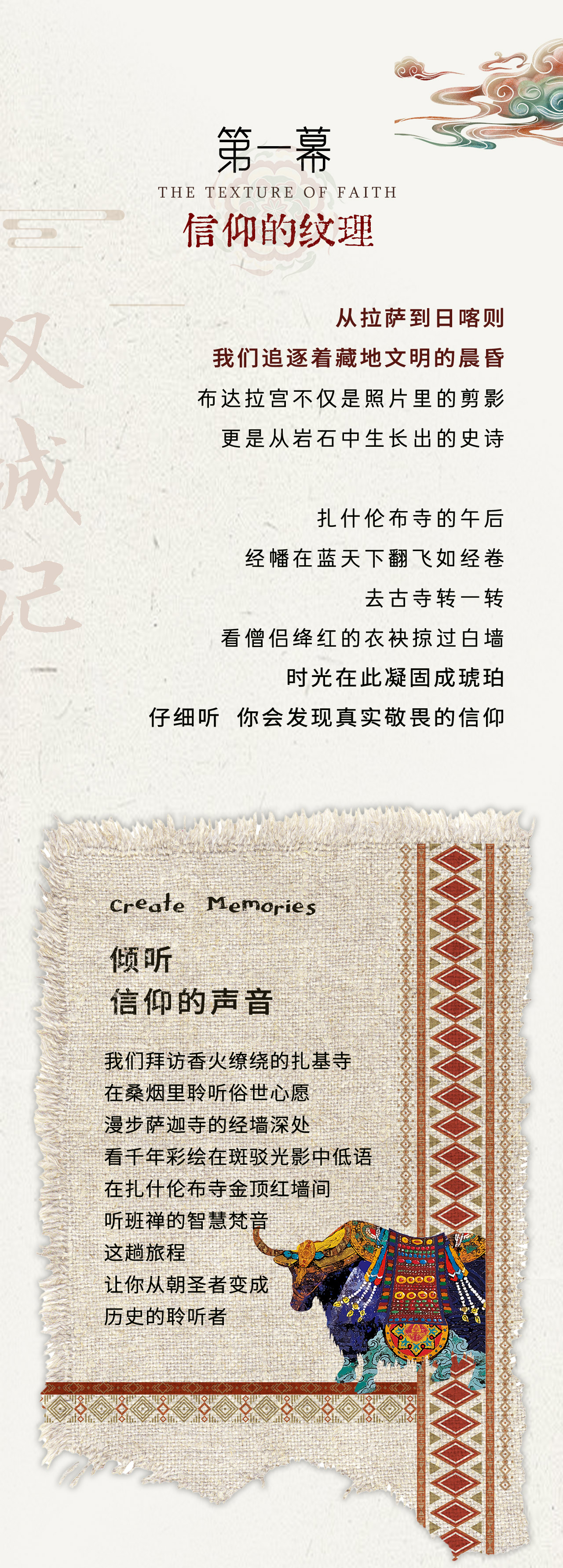 D2:拉萨—布达拉宫—藏式旅拍或藏香手工制作(二选一)—八廓街—藏式年夜宴全天 神圣的雪域圣殿“布达拉宫” 它被誉为世界十大土木建筑之一。是641年吐蕃首领松赞干布为迎娶大唐文成公主所建。布达拉宫分白宫和红宫,白宫是达赖喇嘛生活起居和政治活动的地方;红宫是历代达赖喇嘛的灵塔和各类佛殿。游走于金碧辉煌的佛殿、灵塔、寝宫、回廊之间,灯光渺渺,窗帏低垂,酥油的味道四处弥漫。整个好像落入了一个晦暗古老的梦境。 一次好的旅拍,不是为了拍摄而去旅行。而是在旅行中拍摄,用镜头、用画面把远方的故事牢牢封存,旅拍,恰恰就是一种极致的探索。 在当天的活动结束之后,我们晚上会去体验地地道道的藏餐,品尝到藏式各种各样的美食,酥脆香甜的“卡赛”、精心熬制的“古突”、醇厚的青稞美酒,然后大家一起跳舞一起唱歌一起欢度新年。