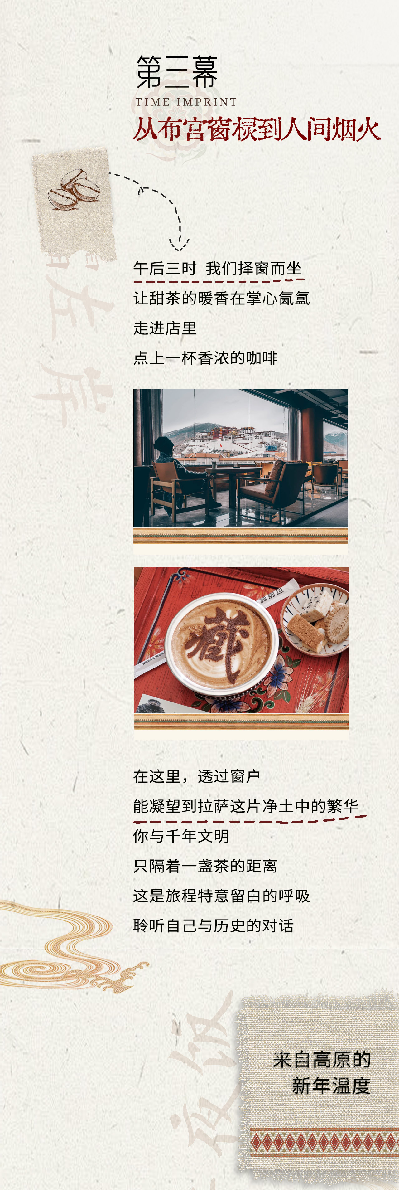 D3:拉萨—扎基寺—西藏博物馆—布达拉宫观景下午茶—拉萨全天 早上从酒店出发,前往扎基寺,扎基寺的“财神爷”在藏语里被称作“扎基拉姆”。据说,这是拉萨城的护法神“吉祥天母”的世间化身,本在汉地,后随一位赴汉地的色拉寺大师来到拉萨(也有说是随文成公主进藏的),后被供奉在扎基寺。扎基寺的财神菩萨是西藏最灵验的,但凡求财的人都来这里供奉“扎基拉姆”。因此,扎基寺便被认作是西藏唯一的财神庙。 随后驱车前往西藏博物馆展厅由史前文化、不可分割的历史、文化艺术、民俗文化四大部分组成。 史前文化展厅向人们展示了,早期在藏北海拔四千米发掘的用以日常生活的石片、石核等旧石器工具,以及在昌都出土的石锛、石斧、石凿和新石器时代晚期的石簇、骨锥、骨针和各种红陶、灰陶、黑陶器具,完整地再现了西藏步入文明社会前具有代表性的时代进程——旧石器时代、新石器时代、青铜时代和铁器时代。 下午比较悠闲,前往布达拉宫观景咖啡馆体验当地下午茶(咖啡+甜品)拥有绝佳的观景位置,可以远眺布达拉宫,店内环境优雅,氛围舒适,是拍照打卡的绝佳地点。不过,天台的景观位有限,一定要文明排队拍照哦。