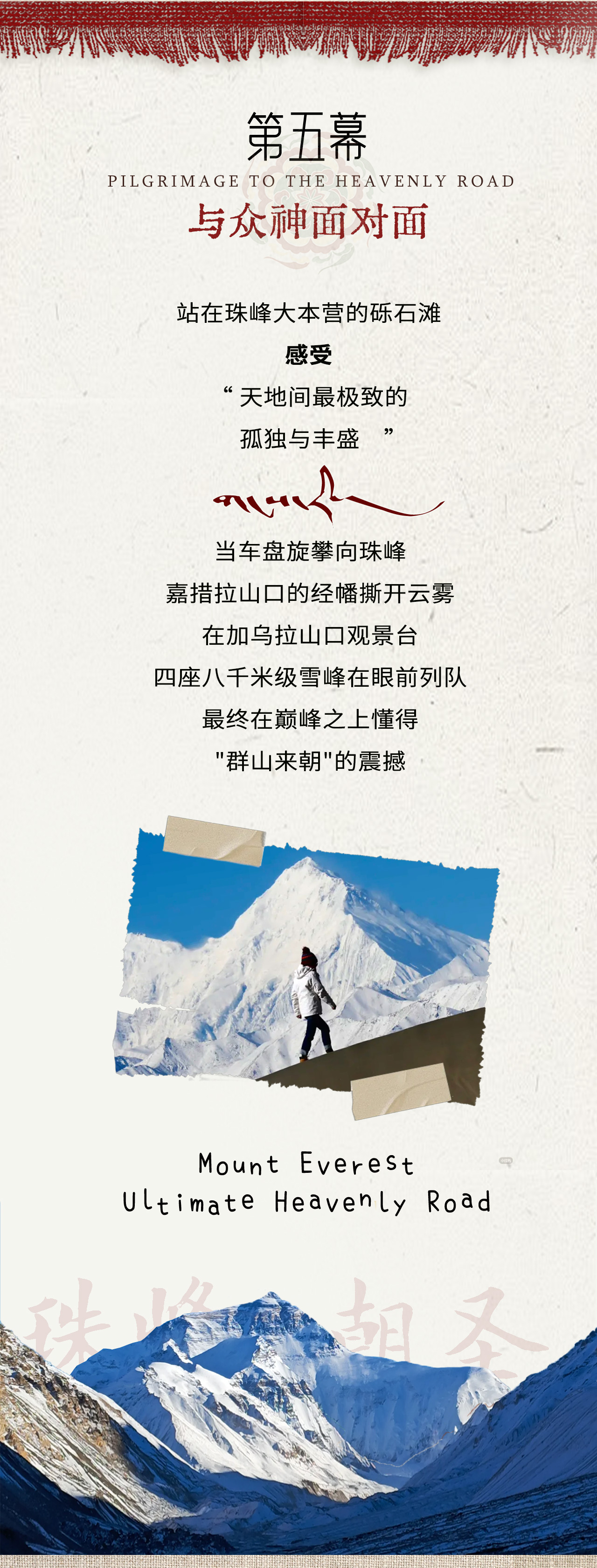 D5:日喀则—嘉错拉山口—加乌拉山口—珠峰大本营全天 早上用完早餐,一路向西前往距离珠穆朗玛峰最近的地方珠峰大本营,前往这座世界第一峰的必经之路就是嘉措拉,因而,嘉措拉山口就是珠峰的门户,这里是珠峰国家级自然保护区的山口,巨大的保护区标牌竖立在公路上,无数的经幡迎风飘扬。嘉措拉山口5248米,水泥标高牌上挂满了五彩经幡。 天气晴朗时,站在加乌拉山山口,不仅可以眺望到珠穆朗玛峰,还可以眺望到另外三座海拔均在八千多米之上的卓奥友峰、洛子峰和马卡鲁峰。诗人聂作平感叹道:"在同一个垭口能够眺望到四座八千米级的极高峰,这在318线甚至全世界所有公路翻越的垭口中,都是绝无仅有的。 下午抵达珠峰大本营,珠峰大本营(是为了保护珠峰核心区域环境而设立的保护地带,海拔5200米,与珠峰峰顶的直线距离约19公里。这里是普通人能到达离珠峰最近的地方,也是距离天空最近的地方,目前珠峰大本营迁至绒布寺附近) 入夜,没有光污染的珠峰大本营是拍摄星空以及星轨的最好去处。 “天接云涛连晓雾, 星河欲转千帆舞”