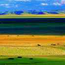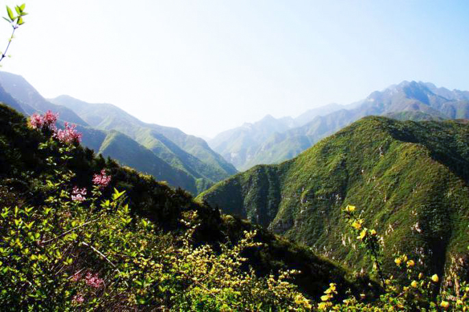 行至梁顶,俯瞰远处山坡上的九间房乡,整齐的农舍,蜿蜒的乡道,成片的农田,披上春的芬香,春季的田园风光尽收眼底……