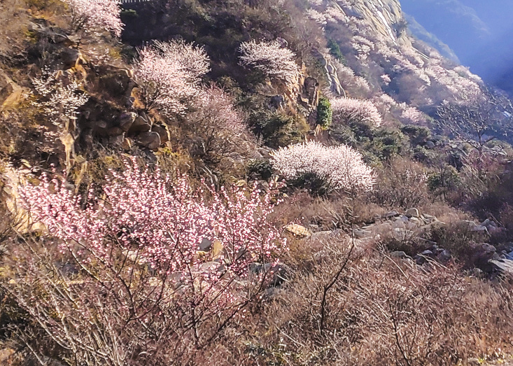 山里的春天桃花盛开,峪道两边的山坡上,一朵朵,一簇簇,一丛丛娇艳的山桃花,迎着春风灿烂绽放,绚丽多姿,香气扑鼻,繁花似锦,争奇斗艳的花海让人眼花缭乱。