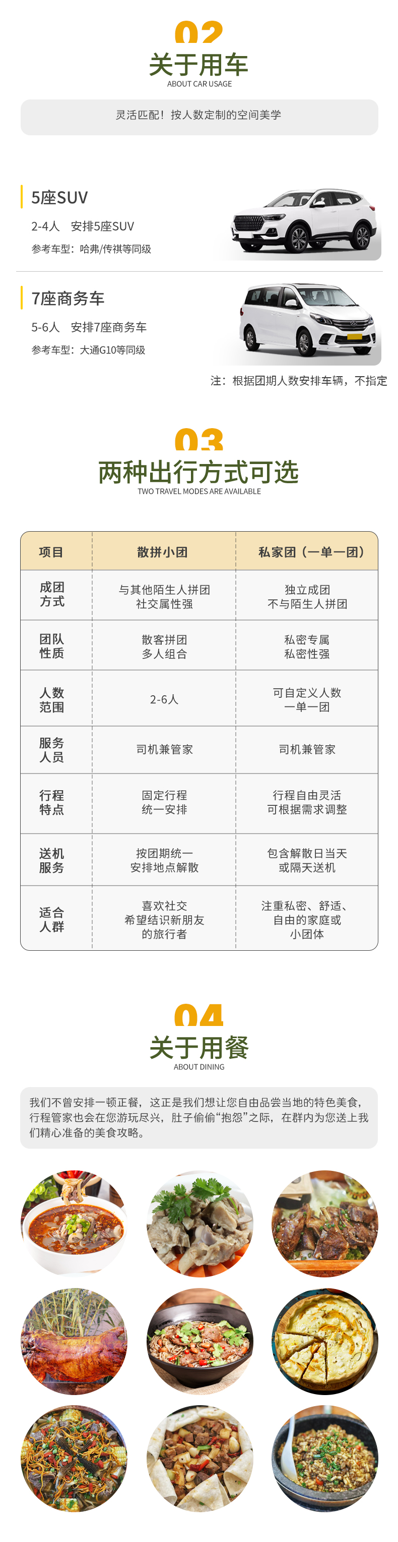 3、交通:2-4人使用5座SUV,5-6人使用7座商务车,根据当期人数安排车辆,不指定用车。(小团副驾驶及前后座位置需要轮流乘坐,望悉知)