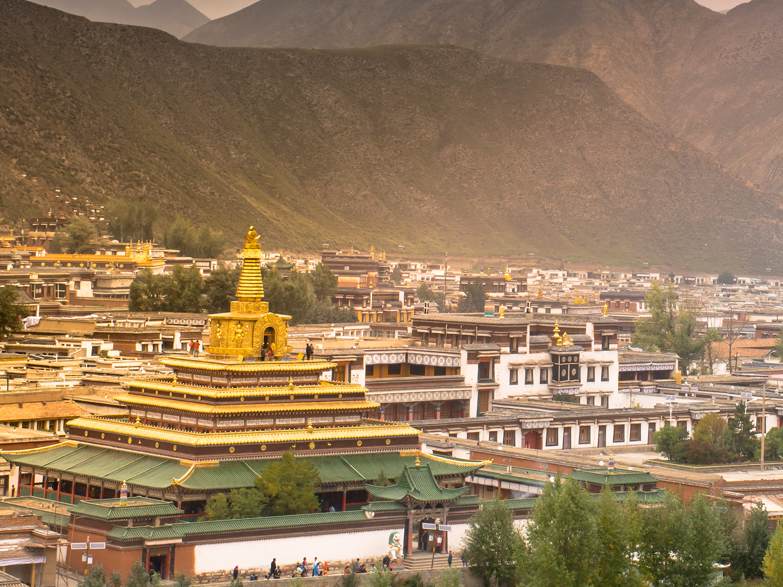 12 : 30抵达世界藏学府【拉卜楞寺】,拉卜楞意为活佛的居所;这里是全世界最有名的藏密学院,拥有中国最完整的藏传佛教教学体系。这里西北山形似银灰色卧像。南山如八瓣瑞莲,大夏河水自西向东流淌,这里山川灵秀,瑞云缭绕,这里也是电影《天下无贼》中的凡间净土,有小西藏之称。