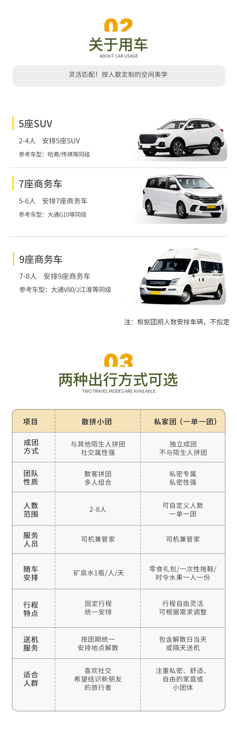 3、交通:2-4人使用5座SUV,5-6人使用7座商务车,7-8人用9座商务车,根据当期人数安排车辆,不指定用车。