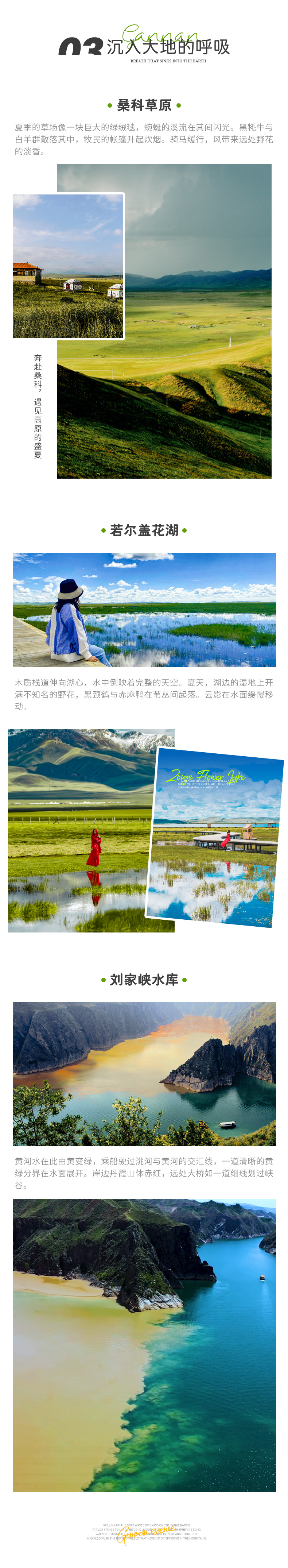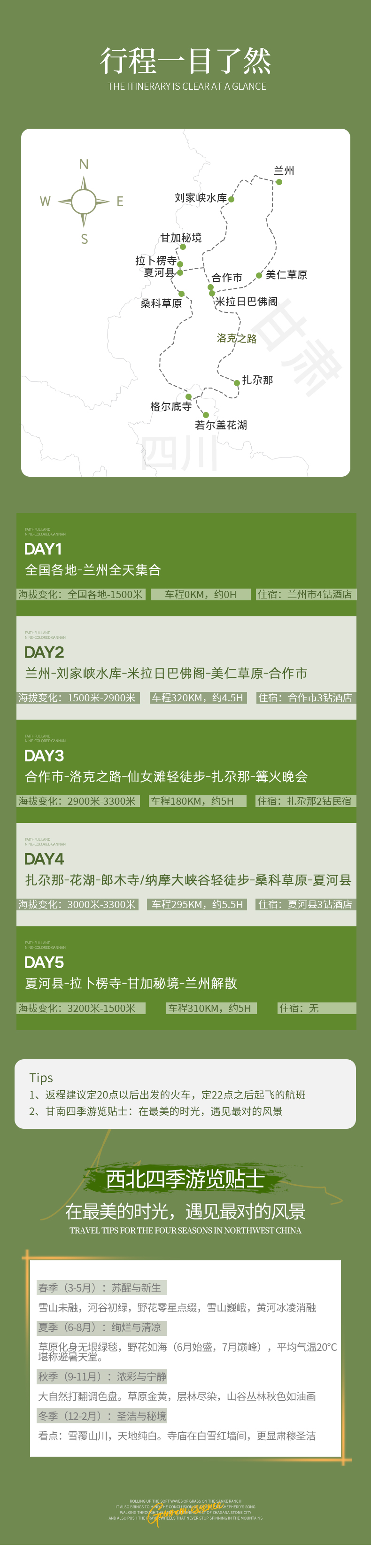 D4:扎尕那晨曦-(105km,约2.5h)花湖-纳摩大峡谷轻徒步-(190km,约3h)桑科草原-夏河县全天 05:30清晨的扎尕那烟雾缭绕,空气清新,在这里,所有的语言都苍白无力,唯有云白风清,心旷神怡,物我两忘。 07:30适时早餐,大家可以选择自由活动或者稍微休息一会。 09:30随后我们整装待发,出发前往花湖,我们途径【甘南小独库公路】,这里相比洛克之路更加原始小众,一路上遍布喀斯特地貌崖壁我们在高山草原上来回穿行,走走停停,美不胜收,一点不输新疆独库公路哦~(如遇封路/交通管制或恶劣天气改走公路) 12 : 00适时自由用餐,随后抵达【花湖】,这里宛如一块镶嵌在川西北边界上瑰丽夺目的绿宝石,是我国三大湿地之一,芦苇丰茂,碧蓝的天空倒映在湖面,身旁不时飞过几只候鸟,非常适合拍照 14 : 00随后抵达郎木寺镇,我们先前往【格尔底寺】,位于四川和甘肃交接的郎木寺镇,是中外驰名的背包客圣地;这里也是之前进藏的必经之地,各族文化在这里融合交汇。随后前往【纳摩大峡谷】,它隐藏在郎木寺的后山里,两侧山坡上被红色、黄色、绿色的植被覆盖,宛若世外桃源,据说最深处藏着白龙江的源头,,感兴趣的小伙伴可以去多多了解一下哦~ 17 : 00适时出发前往【桑科草原】,这里是藏族人民的天然牧场,水草丰茂,夏季草场碧绿如毯,蓝天白云下牛羊成群,一派自然田园风光。 18 : 00晚上入住酒店入住,随后自由觅食。