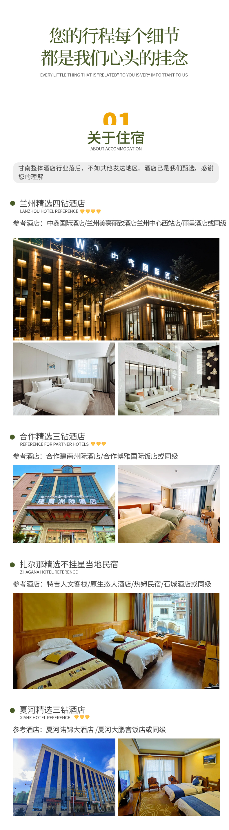 备注:钻级标准参考携程钻级标准,甘南经济发展较差,酒店已经是我们精心挑选的,但是和大城市同级别酒店相比各方面略差一些,敬请您谅解;