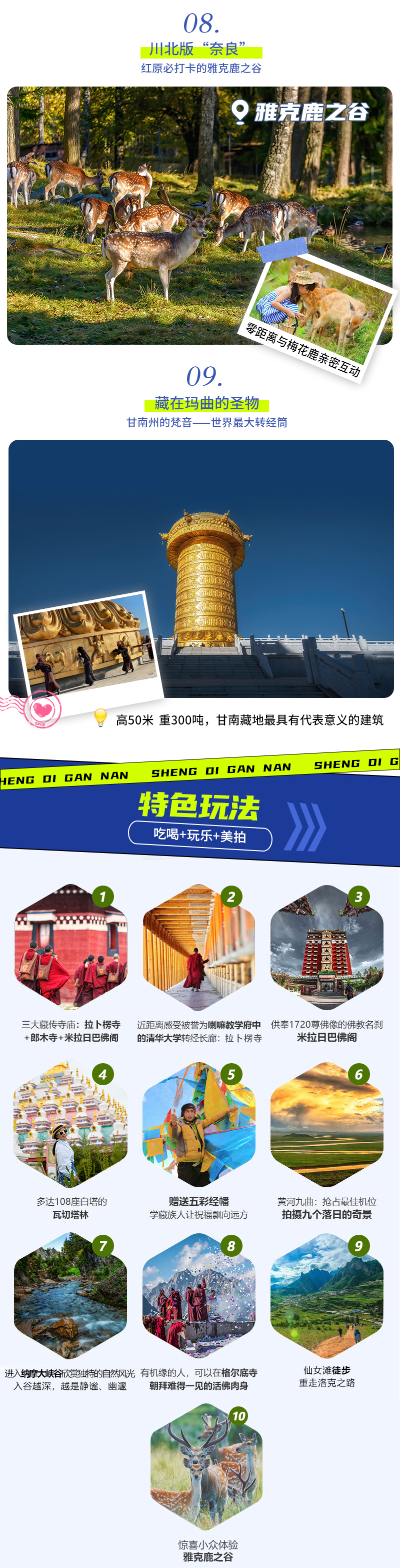 D6:莲宝叶则—娘玛寺—世界最大转经筒全天 早餐后,向着中国最具潜力的秘境美景【莲宝叶则】出发。莲宝叶则风景区属巴颜喀拉山南段支脉,境内最高海拔5141米,山峰平均海拔在4000米以上,是藏区著名的神山,位居藏区十大神山的第八位,安多地区众神山之首。 莲宝叶则藏语意为:尊严的玉石之峰,其内石峰林立,云雾缭绕,山势雄伟奇峻、湖泊星罗棋布。著名的四大湖是:扎尕尔措、措拉玛、罗云措、珠姆措。其中扎尕尔措湖海拔最高,风景最好。扎尕尔措湖口东侧是雄浑的石峰,西侧有一座一大二小的尖利石峰直刺天空,像极了守卫湖泊的门将和他手里所执的宝剑。除了怪石嶙峋的奇峰异石和幽静深邃的高山圣湖相映衬,莲宝叶则附近还聚集着藏传佛教五大教派的大寺,格尔登寺、郎依寺、赛格寺、德格寺、各莫寺、尼姑庙等,殿塔林立,僧人众多,经常有僧人来湖边,朝拜心中的圣湖,是极好的拍摄素材。你也可以跟随虔诚的信徒一起转湖,为自己和家人祈福,之后我们会带领大家登上观景台,用上帝视角俯瞰整个扎尕尔措,夏季的扎尕尔措清澈见底,群山倒影湖中,如梦如幻,仿佛一颗巨大的蓝宝石镶嵌其中。今天我们在莲宝叶则游玩时间较长,请大家提前备好午餐。 适时离开,前往【娘玛寺】,虽然娘玛寺的名气不如甘南州其他寺庙,但这里坐落着【世界最大转经筒】,该转经筒高达35.8米,下部直径12.43米,上部直径17.6米,重达320吨,创下世界吉尼斯记录!不光体积巨大,整个筒身用掉黄金100多斤,仅仅经书的重量就高达86吨,对于虔诚的藏族人来说,转经筒里装的经咒越多、转一圈的周长越长,那么转一圈积累的功德就越多。 尽情观赏后,前往玛曲县城入住休息。