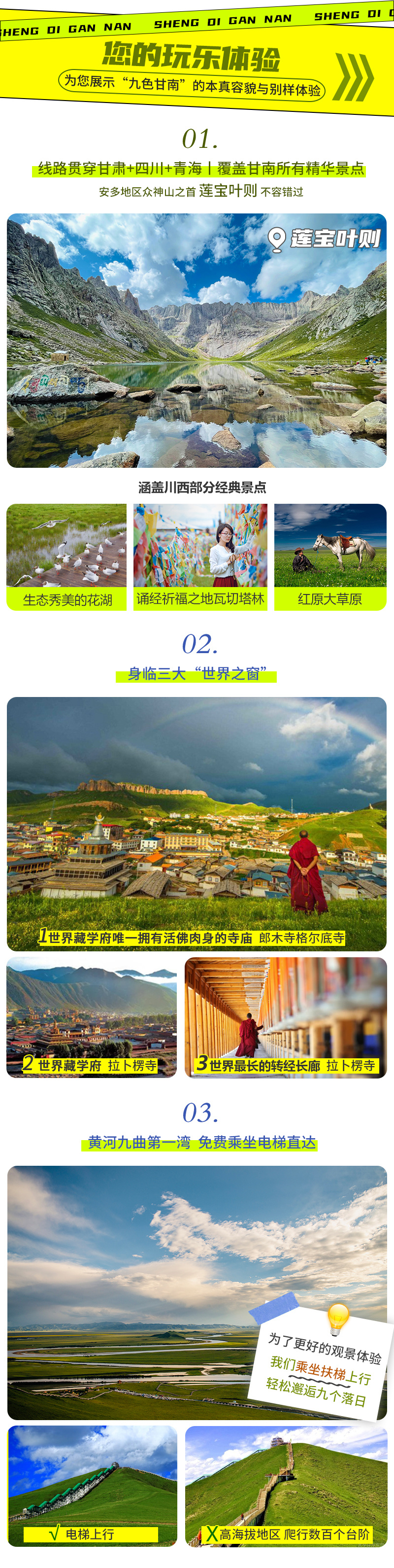 D2:兰州—米拉日巴佛阁—郎木寺全天 晨起出发,领略千沟万壑,沟壑纵横的黄土地貌。我们一路前往【米拉日巴佛阁】。佛阁是为了纪念最富传奇色彩、妇孺皆知的米拉日巴尊者而修建的,是供奉1720尊佛像的佛教名刹。楼高共九层,每一层都代表了藏传佛教的一个时代或支派,除藏传寺庙主佛外,这里还供奉着已经被神化的藏族历代名人,包括松赞干布和文成公主。米拉日巴佛阁融藏族堡式建筑和佛阁式建筑特色为一体。每一层皆有不同主题,第九层是坛城,画在第八层的天花板上,常人无法到达。坐在坛城下仰望,时刻警示着人类的局限而需保持谦逊,又鼓励着人们追求未知境界,纪录片《第三极》就曾记录这个场景。 随后我们去【郎木寺】四川寺,参观这座拥有千年历史的古寺,拍摄神秘的藏传佛教寺庙建筑,气势恢宏的寺院佛塔与峻峭飘逸的清真寺宣礼塔并坐于小镇的蓝天下,这就是传说中的香格里拉吧,在这里你可以深切感悟到佛教文化的宽容谦让和两种宗教文化在世俗生活中求同存异的风采。郎木寺(四川寺)格尔底寺,寺内供奉着该寺第五世活佛的肉身灵塔,据说是所有藏传佛教寺院中唯一拥有【活佛肉身】的寺院。夕阳西下,静谧柔和的圣光洒在虔诚的信徒身上,一片祥和安宁。 沿着郎木寺走过草原,有一条明晃晃的小河,将两岸的建筑珍珠般串了起来,跨过源头再向里走,峭壁悬岩,危峰兀立,直冲云霄。这便是【纳摩大峡谷】,峡谷悠悠的白云在山峰之间飘游,沟中央裸石累累,两旁花草茂密,繁花似锦,花香醉人,流水时断时续,偶尔还有小动物从面前逃遁而去。入谷越深,越是静谧、幽邃,这里尚未被开发,走到尽头有一片开阔的草甸映入眼帘,牛羊慵懒地啃食着青草,恍若世外桃源。 在纳摩大峡谷徒步后,回酒店休息。