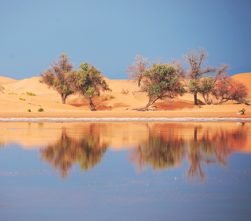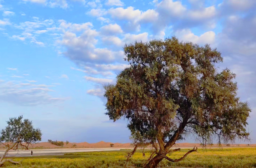 我们在沙漠徒步过程中经过湖泊、小型水潭均可见美丽的梭梭树、沙枣树等植被。