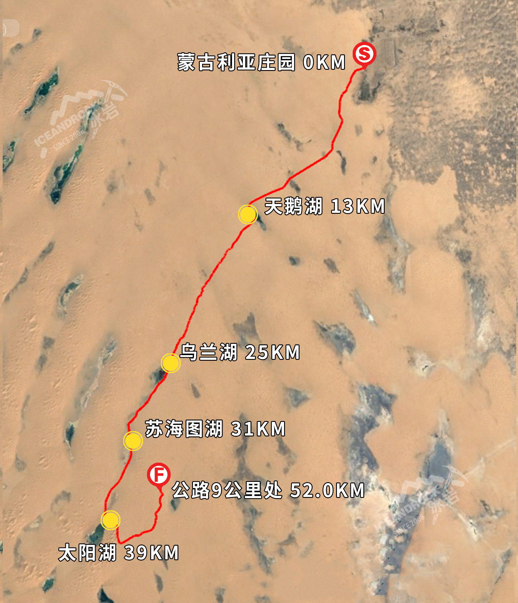五湖连穿路线位于腾格里沙漠东南方向,全程行程52.0KM,最高海拔1388米,最低海拔1246米。