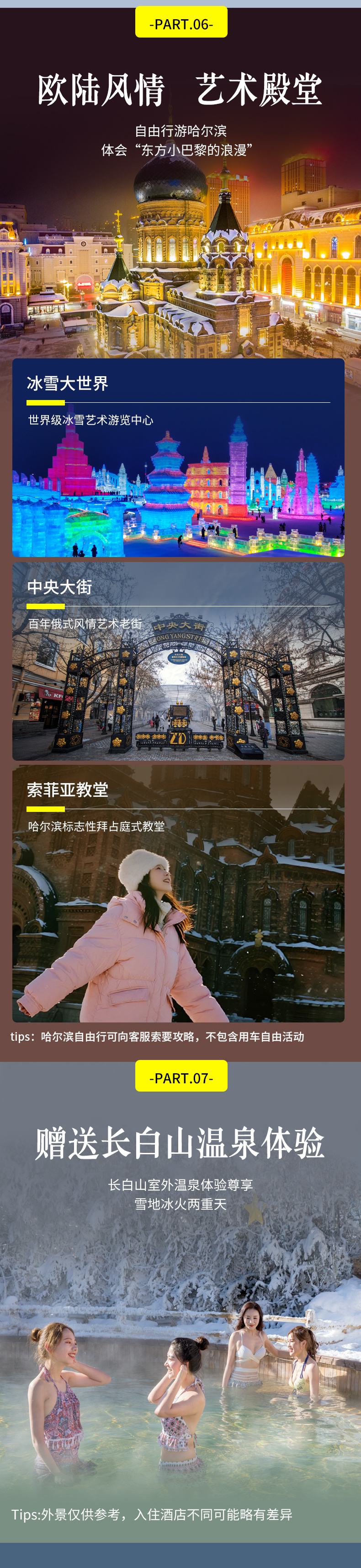注: 1、亚雪公路-哈尔滨高速路段如遇天气或政府原因封路改走五常或乘坐高铁返程抵达哈尔滨,高铁票费用自理。 2、返程火车建议定20:00以后的车次,返程机票建议定23:00以后起飞的航班。 3、想在哈尔滨再住一晚的小伙伴,也可以联系客服代订哈尔滨酒店,也可以和客服索要哈尔滨的游玩攻略。 4、冰雪大世界攻略: 哈尔滨火车站-冰雪大世界(10km,打车约25元) 哈尔滨西站-冰雪大世界(13km,打车约35元) 哈尔滨太平国际机场-冰雪大世界(40km,打车约150元) 中央大街-冰雪大世界(8km,打车约18元) 中央大街有去冰雪大世界的往返直通车,20元/人车费,15:00开始每半小时左右一班,会限制游览时间在1.5-2小时左右。 公交车专线:213路、125路、551路、211路、126路、119路、29路、47路、80路。 冰雪大世界一般是每年12月25日左右开业,次年阴历正月十五左右闭园,营业时间为11:00-21:00,电话:0451-58561401。