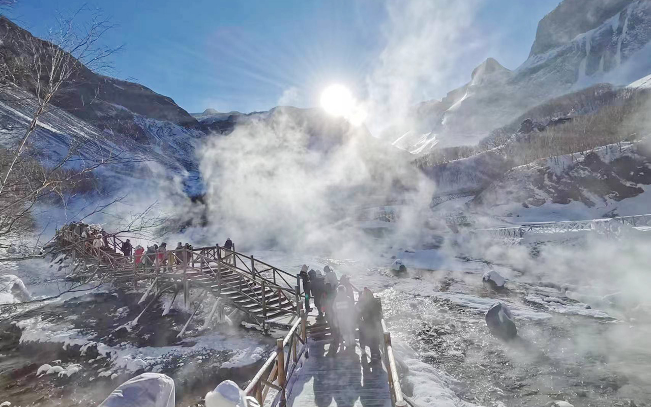 12:30 乘倒站车返回到中转服务站,换乘环保车赴【长白瀑布】,车程约10分钟,步行约20分钟到达长白冰雪瀑布底部近距离观看、摄影,参观【聚龙温泉群】,周围一片白雪,中间却热气腾腾,甚是美丽,游览30分钟,步行20分钟返回瀑布停车场。