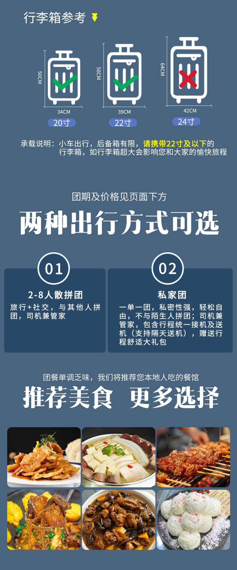3、用车:2-4客人用5座SUV,5-6客人用7座商务车,7-8客人用9座商务车(小团副驾驶及前后座位置需要轮流乘坐,望悉知);