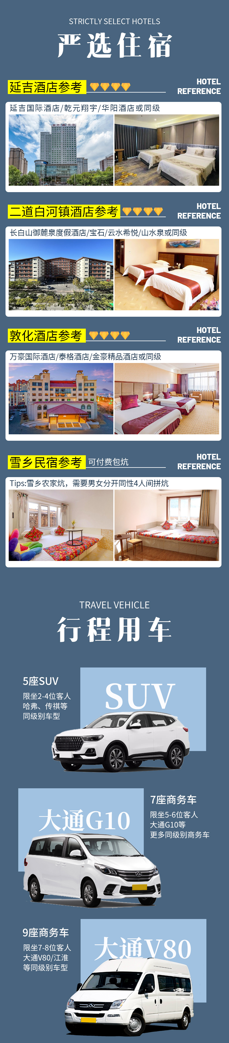 4、不含接送机,如需安排请最少提前2日和客服联系,哈尔滨接送机包车5座轿车150元/趟,夜航190元;7座商务车240元/趟,夜航290元/趟;夜航时间为21:00及以后-次日07:00及之前落地或起飞的航班,春节团期+50元/台车,包车费用以太平机场前往哈尔滨主城区定价(南岗区、道里区、道外区),如需包车前往其他区域请联系客服现询价;接机车辆非行程用车无空座。延吉朝阳川机场距离市区较近建议自行打车,参考价格30元左右