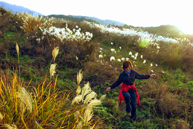 攀援一段临渊石径,来到山坳苇荡,被一片没顶芦苇淹没。在荡歇脚打尖,斜依松软的苇床上,任苇絮雪花般撒落。日当正午,沐浴暖暖阳光,甚是快活。