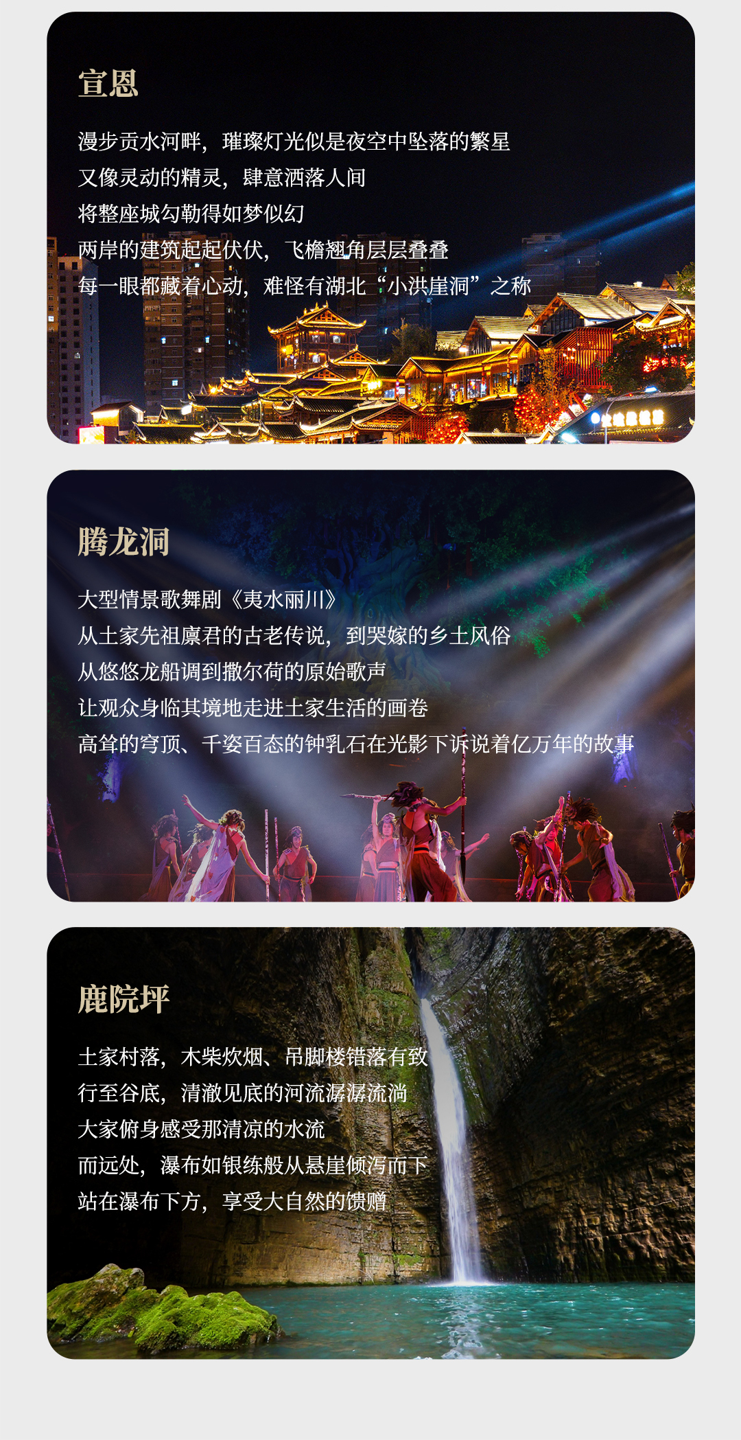 D2:恩施 - 屏山峡谷 - 仙山贡水 - 恩施全天 上午奔赴 4A 级景区,这片被誉为“东方仙本那”的奇境,形成于第四纪冰川时期,集奇、秀、险于一身。沿步道下行至峡谷河畔,移步换景间尽览自然野趣。百余丈深的峡谷里,溪水碧蓝澄澈,通透见底。 晴日里,阳光折射水面,泛舟其上如凌空悬浮,仙气飘飘;雨天时,谷内温差催生薄雾,云雾缭绕间,宛若闯入缥缈仙境。 尽兴游玩后,乘大船顺峡谷穿行返程,沿途风光依旧惊艳,千万别眨眼,错过每一处心动瞬间! 暮色降临,泛舟贡水河畔,边享晚餐边赏宣恩夜景。餐后可自由漫步河畔,沉浸式感受小城的宁静与烟火交织的独特韵味。 注:如遇旺季期间用餐船只资源紧张,届时将灵活替换为宣恩特色烤活鱼晚餐,地道风味敬请品鉴。 这座浪漫小城,一河两岸灯火璀璨,半城烟火半城仙。拥有国内最长的音乐跑泉灵动跳跃,恰似仙女遗落的丝带在空中翩跹。