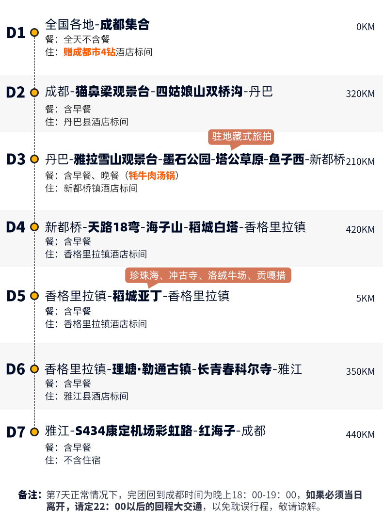 注: (1)以上行程时间安排可能会因天气、路况等原因做相应调整,正常情况下完团回到成都时间为晚上18:00-19:00,如果必须当日离开,请定22:00以后的回程大交通,以免耽误行程,敬请谅解; (2)以上行程及时间仅供参考,具体以实际出发行程及时间为准,在不减少景点的情况下,我公司有权调整行程游览的先后顺序。