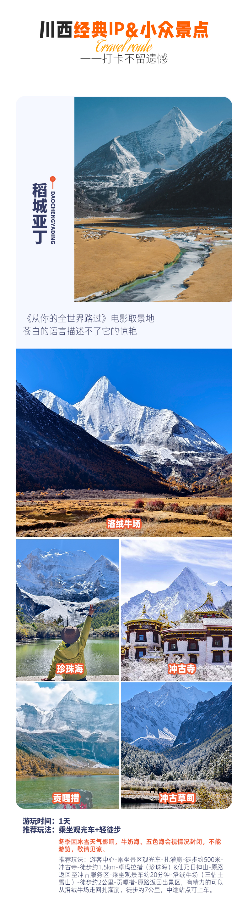 注: (1)驾驶员将在亚丁景区停车场等待大家,请大家按照与驾驶员约定的时间回到集合点,队员因自身原因误点超过发车时间30分钟,视作自动放弃; (2)亚丁风景区内专门经营的饭店比较少,队员们可以在景区内洛绒牛场餐厅用餐,但由于景区内所有的生活物资都需要从外面运进来,所以还是需要提前做充足的准备,建议自备一些零食、巧克力以便充饥; (3)冲古寺~洛绒牛场观景车:共设起点站(冲古寺站)、1号站(千佛山站)、2号站(圣水湖站)、3号站(央迈勇站)和终点站(洛绒牛场站)五个站点,游览车全程票70元(往返),单程票40元,区间票每站10元(可选择徒步,客人自愿自主消费); (4)冬季因冰雪天气影响,牛奶海、五色海会视情况封闭,不能游览,敬请见谅;当天游览线路参考:景区游客中心-景区观光车约1小时-扎灌崩-徒步0.5km-冲古寺-徒步1.5km-卓玛拉措(珍珠海)-仙乃日神山-原路返回至冲古服务区-观景车约20分钟-洛绒牛场(三怙主雪山)-有精力的可以继续徒步约2KM至贡嘎措-原路返回出景区。