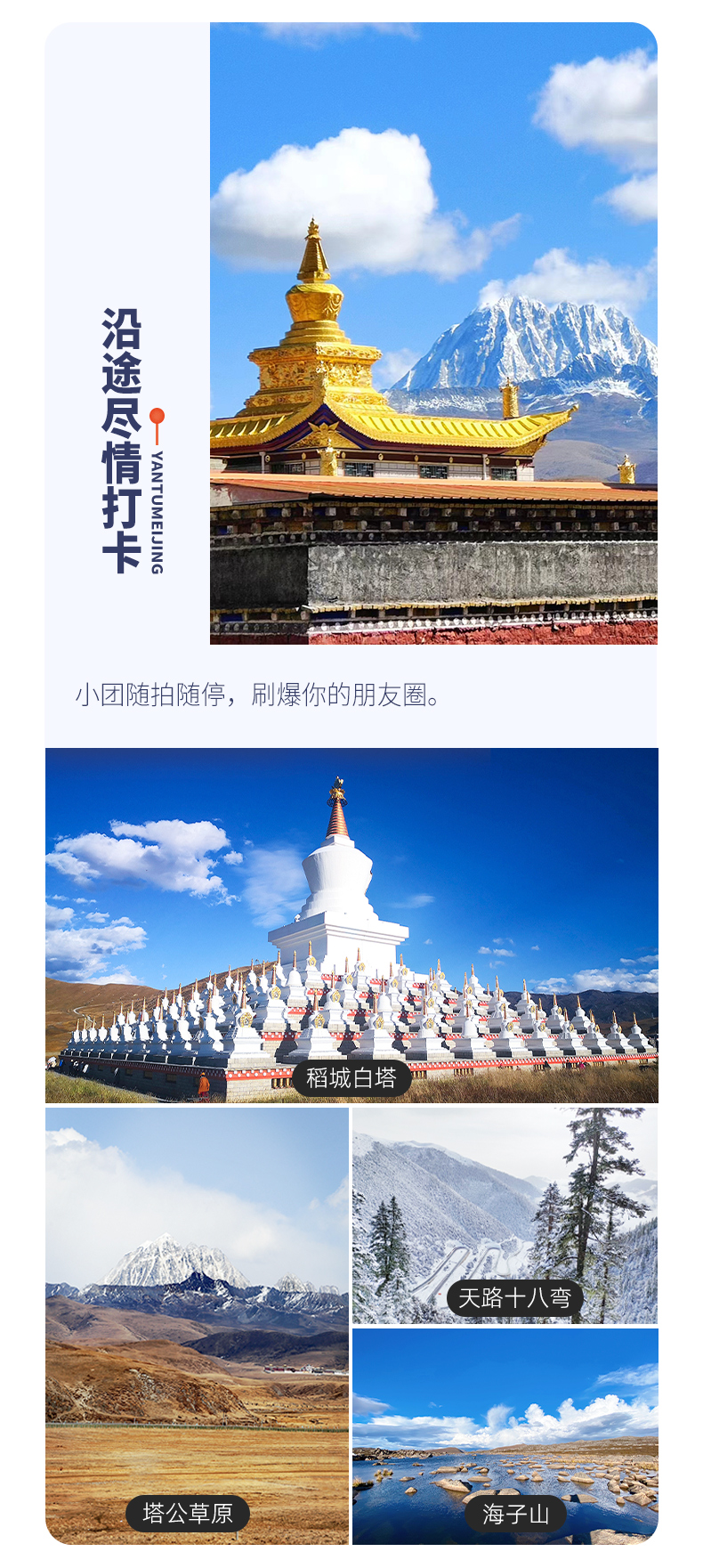 D4:新都桥-天路18弯-海子山-稻城白塔-香格里拉镇全天 早餐后欣赏新都桥的炊烟袅袅,观赏藏式民居风光。穿越【高尔寺隧道】,欣赏【雅砻江】的奔腾万里,体验雅江的魅力,沿途观赏【天路十八弯】的险峻,穿越【剪子弯隧道】,随后翻越【卡子拉山】(垭口海拔4718米),途径【丁真的家乡】——理塘,继续行车,经无量河,翻越形似兔子的【兔儿山】(垭口海拔4696米),途经青藏高原最大的古冰川遗址、稻城古冰帽——【海子山】自然保护区(海拔4500米),经桑堆小镇,当一座美丽的【白塔】映入眼帘的时候,我们就抵达了稻城,而后继续行车前往香格里拉镇入住。