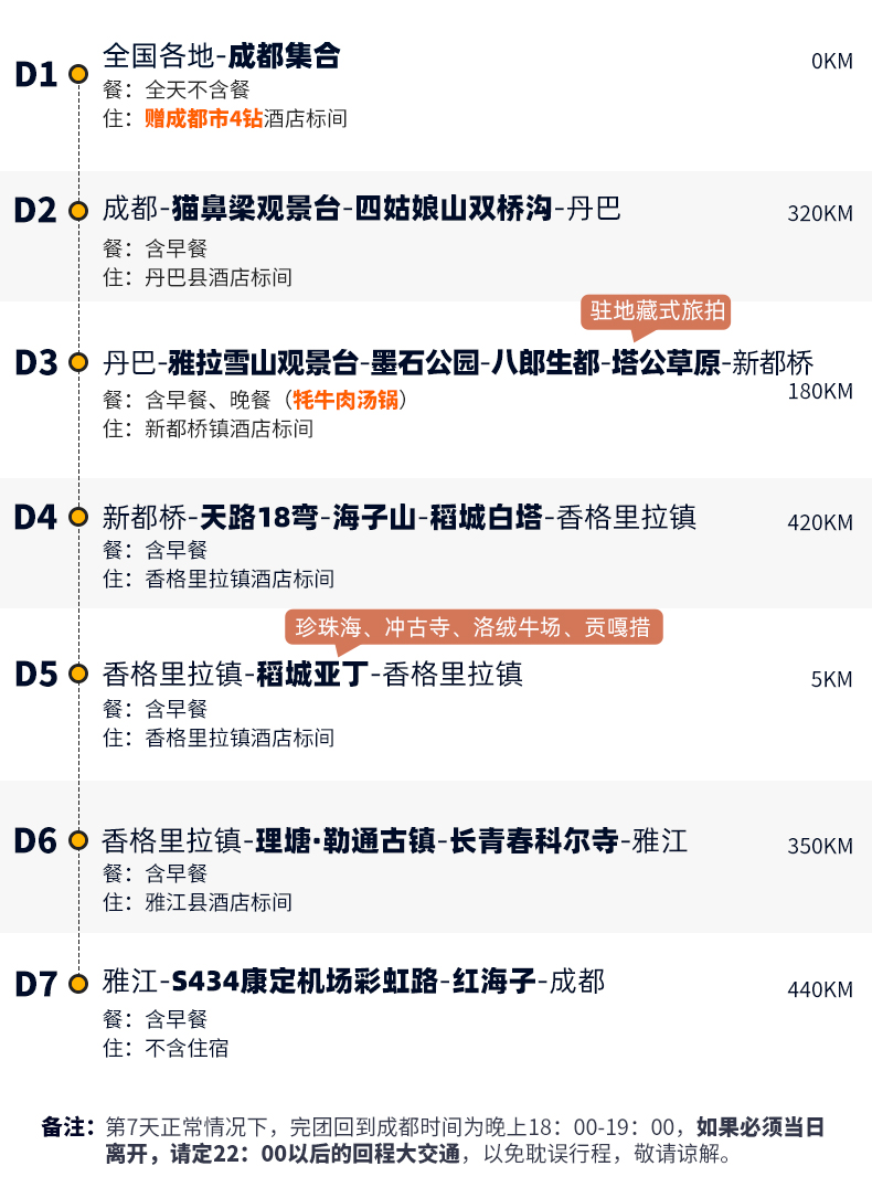 注: (1)以上行程时间安排可能会因天气、路况等原因做相应调整,正常情况下完团回到成都时间为晚上18:00-19:00,如果必须当日离开,请定22:00以后的回程大交通,以免耽误行程,敬请谅解; (2)以上行程及时间仅供参考,具体以实际出发行程及时间为准,在不减少景点的情况下,我公司有权调整行程游览的先后顺序。