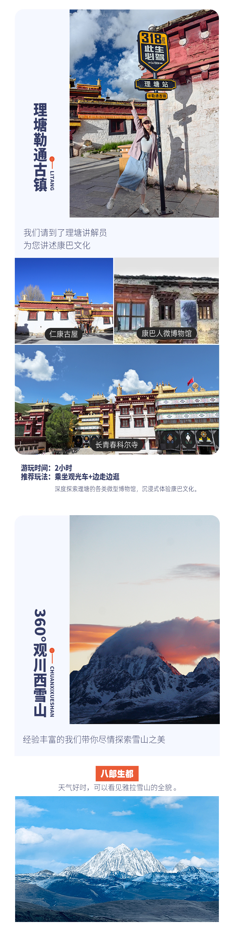 D6:香格里拉镇-理塘·勒通古镇-长青春科尔寺-雅江全天 早餐后前往【丁真的家乡】——理塘,这里风景绝美,六世达赖喇嘛仓央嘉措曾在诗里写下自己对理塘的向往:“洁白的仙鹤啊,请把你的翅膀借给我,我不会飞到很远的地方,我到理塘转转就回......‘’我们将在理塘游览《丁真的世界》宣传片里出现的【勒通古镇·千户藏寨】,这是全世界规模最大的传统藏寨群落,有超过4000栋的传统藏房,是探寻藏文化和康巴风情的不二之选。在这里,我们可以随着景区讲解员的讲解依次游览:【康巴人微博物馆】、【仁康古屋(先后降生过十三位德高望重的大活佛)】,随后参观康区历史最悠久、规模最大的藏传佛教黄教寺庙——【长青春科尔寺】,聆听它的传奇故事。游览后前往雅江入住。