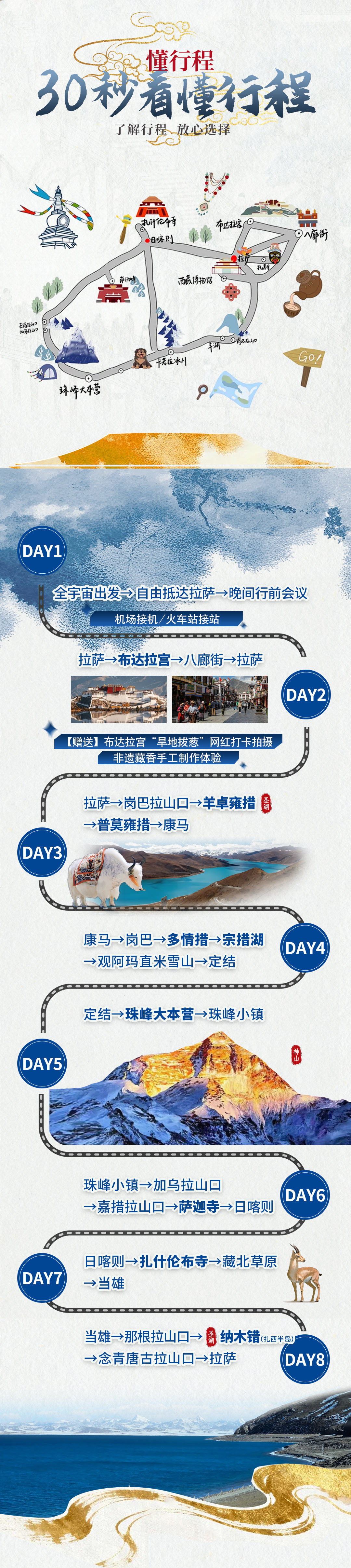 D8:当雄—那根拉山口-纳木措(扎西半岛)-念青唐古拉山口-拉萨全天 上午从当雄启程向纳木措行驶,纳木措是自然与人文在壮丽的天地间搭配。蓝色的圣湖,就如同大海一般,直插脑海。不知是谁创造了这样的美景?最圣洁的雪山,最纯净的湖水,在雪域高原,它们总是相依相伴。一个浑然天成的水湾,就出眼前,与那湛蓝的湖水相接。构成了天地间最美的画。 之后拉萨享用尼泊尔风味餐,结束行程