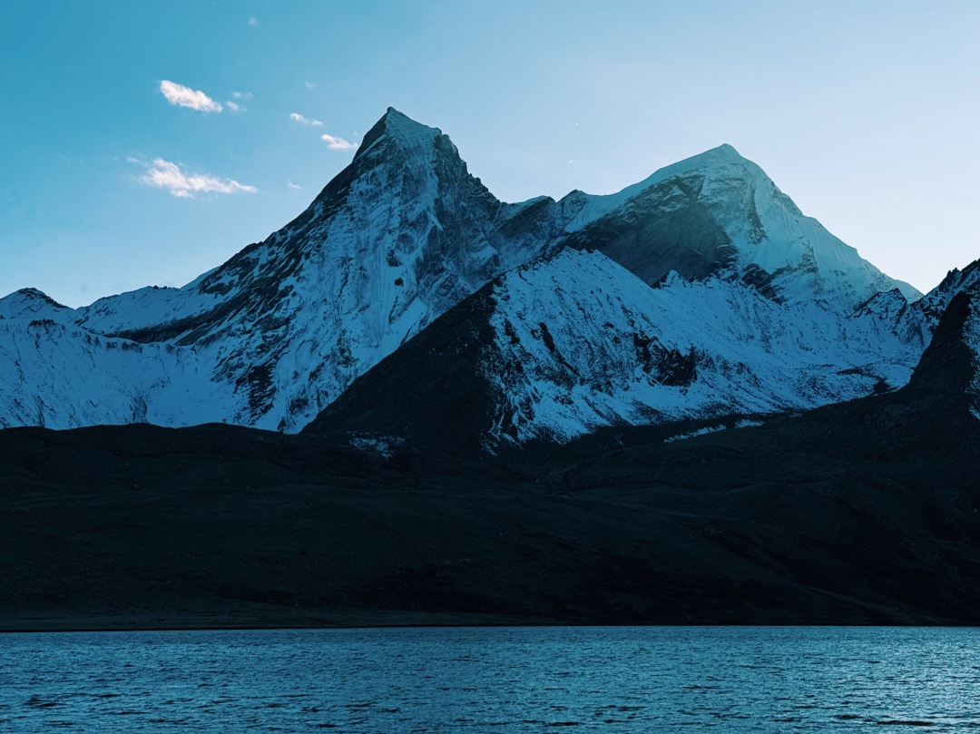 早餐之后我们从康马的千年古寺与圣湖启程,沿边境线向雪山深处前行,便撞进岗巴的苍茫与圣洁。古堡矗立千年,冰川融水成泉,每一缕风都带着信仰的纯净。多情措静卧山间,以“有缘”之名,将雪山、流云悉数揽入怀中。行至宗措湖,海拔近五千米的澄澈湖面,如天工打磨的明镜,完整倒映阿玛直米的雄姿。这座三棱锥状的雪山,刺破苍穹,日照金山时,金辉覆雪,天地间只剩震撼,一路湖光映雪山,古堡伴经幡,从康马到定结,这条小众环线,藏着喜马拉雅最原始的诗意与壮阔。