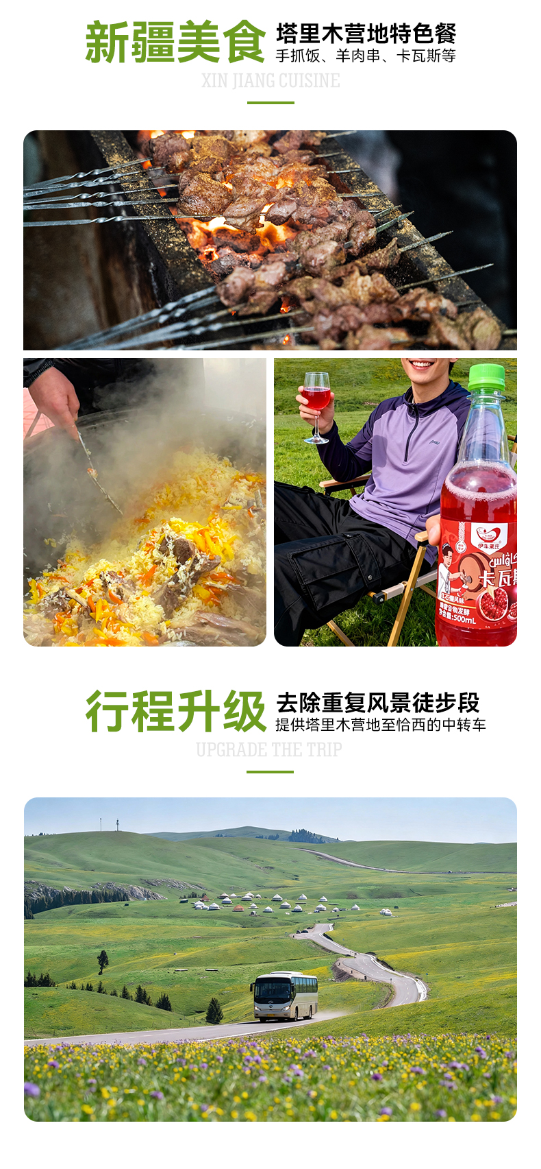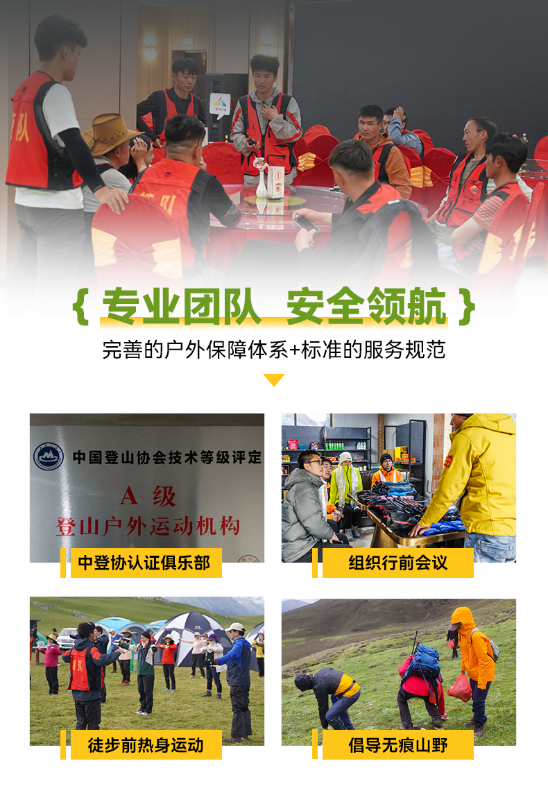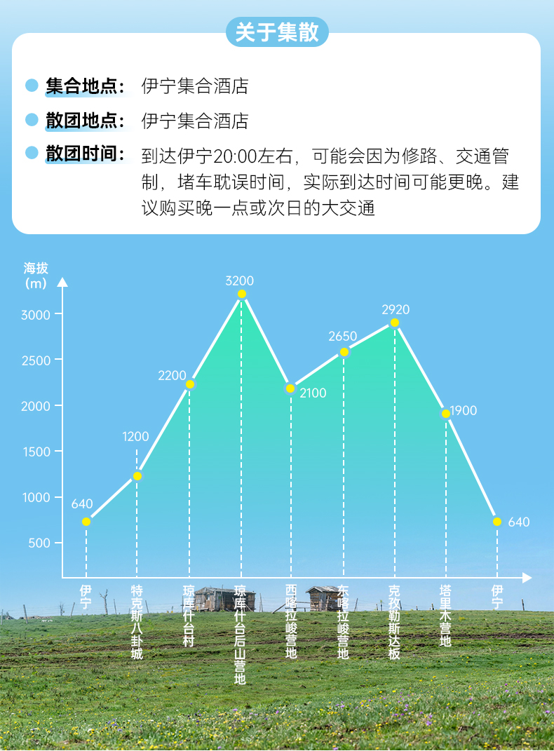 注: 1.行车过程中可能会因为节假日,交通事故等客观因素导致塞车而延缓到达时间;从而延缓到达营地时间(具体时间不定) 2.在特克斯县城请及时补充物资(干粮等高热量的食物补充体力,全程午餐均为路餐,请依据自身情况合理补充)。