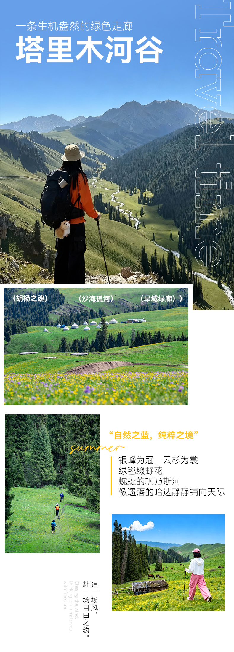 D6:塔里木河营地-(徒步约12km,约4h)恰西草原-(车程约200km,约4h)伊宁全天 早餐后又即将开启新一天旅途,然而这片土地不会让每一位远赴的人失望,每天都有不一样的感受,每一幅画面,每一朵云彩都让人沉醉,每一簇鲜花的摇曳都是在欢迎你的到来,每一寸草地都不会显得突兀,人与景,景与天地都是那么和谐,就如宫崎骏动漫里刻画的世界一般。