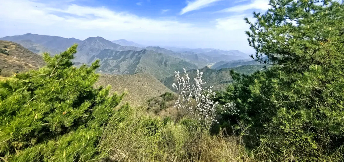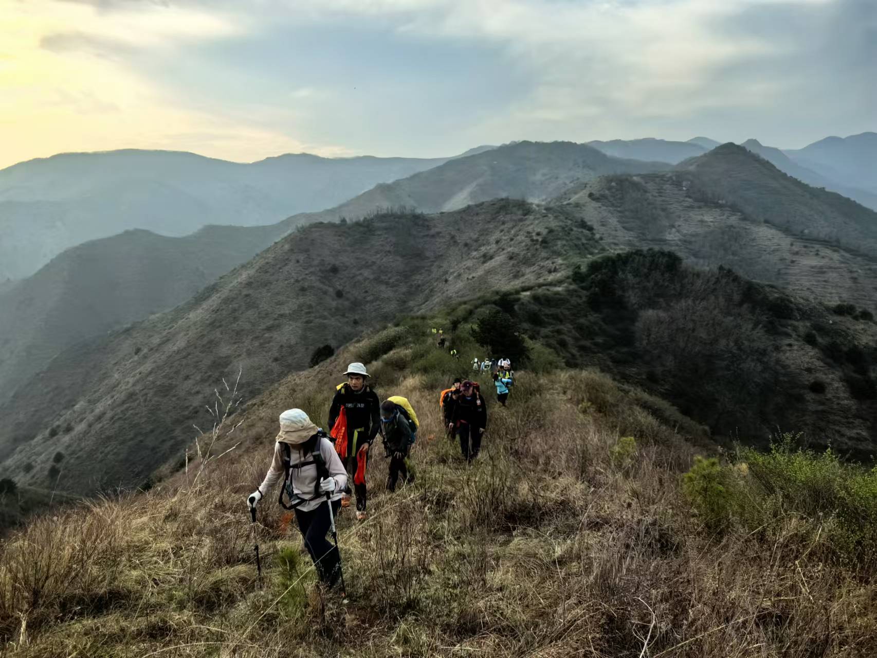 13:30 午餐结束,继续穿山,行走在起伏的山梁之上,时不时还有桃花相伴。 山中本没有路,走的人多了就是路。