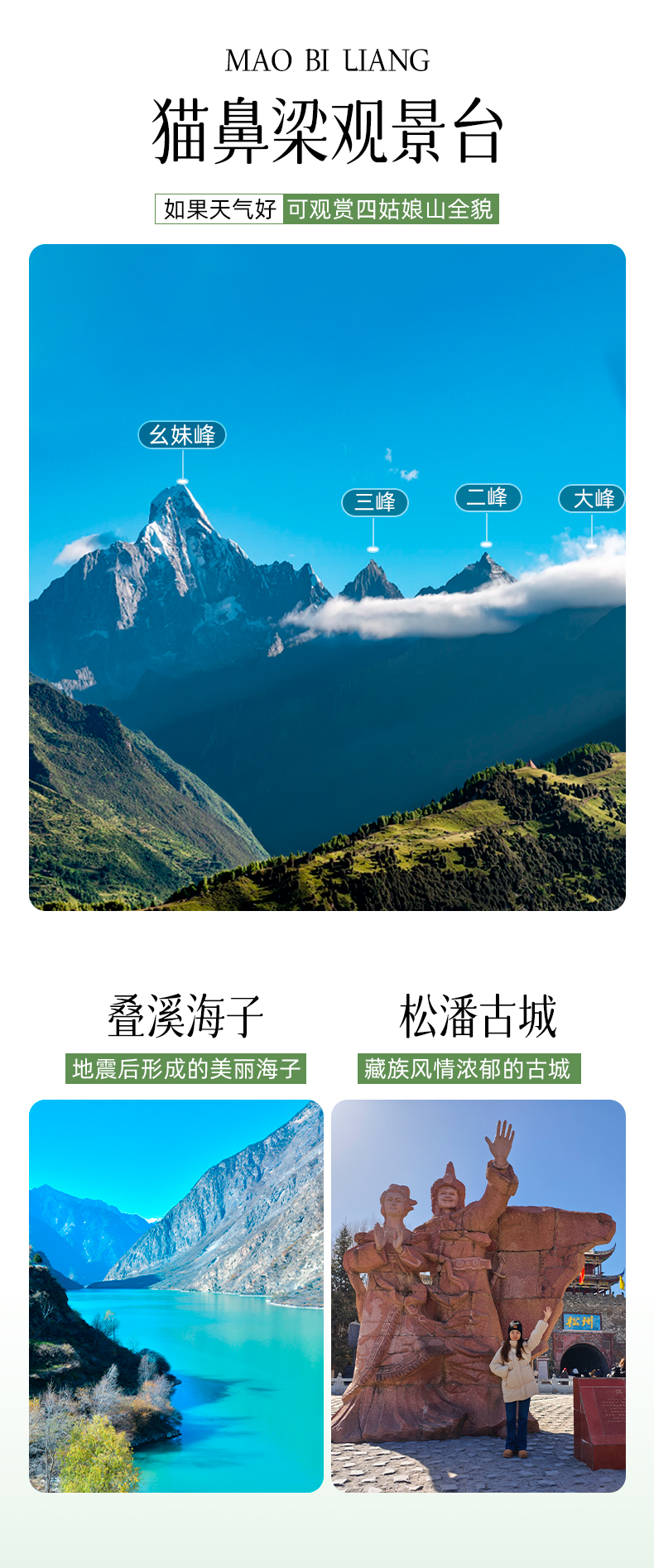 D4:茂县-叠溪海子-松潘古城-黄龙景区-川主寺镇全天 早餐后从茂县出发,沿着岷江而上,随后来到【叠溪海子】,这儿碧波荡漾、风景秀美,被称为“中国最美的地震遗址”,您可以在此驻足,感受大自然的鬼斧神工与历史的沧桑变迁。接着到达【松潘古城】游览,这里曾经是川、甘、青三省边区最大的贸易集散地,古城墙保存完好,城内布局依旧。随后继续前行,不一会儿便抵达【黄龙风景区】(索道上行80元/人、下行40元/人,费用自理,建议乘坐上行),这是一个以奇幻美丽的钙化池闻名于世的景区,景区内众多的钙化池池水清澈见底,呈梯田状排列,五光十色非常漂亮,还有森林、峡谷、雪山、瀑布等众多的自然风光,被称为“人间瑶池”。以彩池、雪山、峡谷、森林“四绝”著称于世,加上滩流、古寺、民俗称为“七绝”。游览后前往川主寺镇入住。