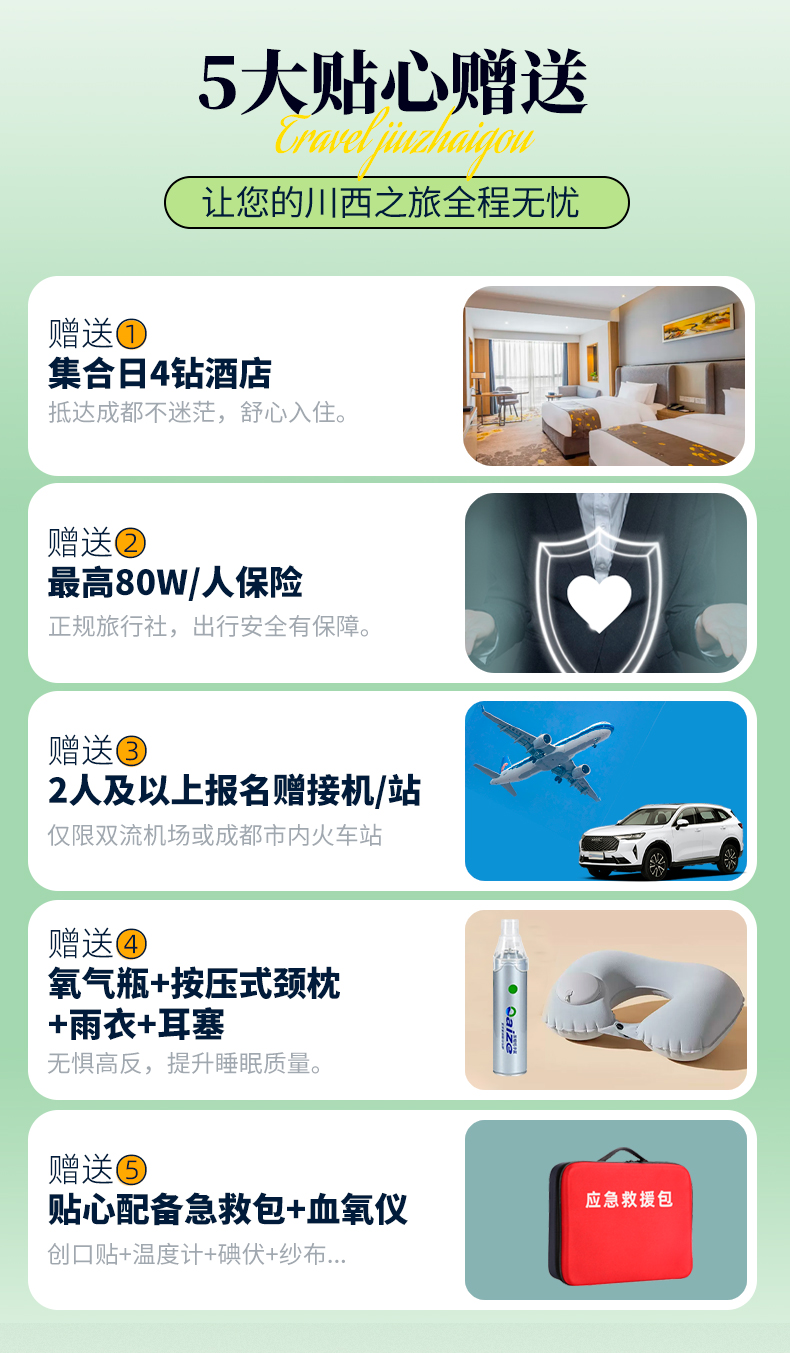 6、2人及以上报名赠成都双流机场接机/市内火车站接站(成都东站、成都南站、成都西站)1次,天府机场接机需自理费用。