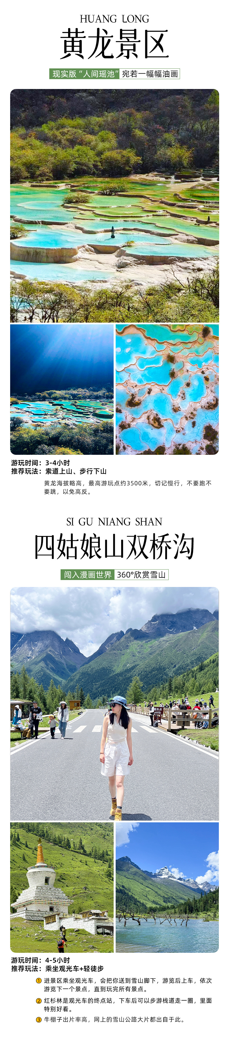 4、景交:卧龙中华大熊猫苑观光车20元/人(可选),四姑娘山双桥沟观光车70元/人(必须),黄龙索道上行80元/人(建议乘坐)+下行40元/人(可选)、黄龙观光车20元/人(可选),九寨沟观光车淡季80元/人、旺季90元/人(必须);