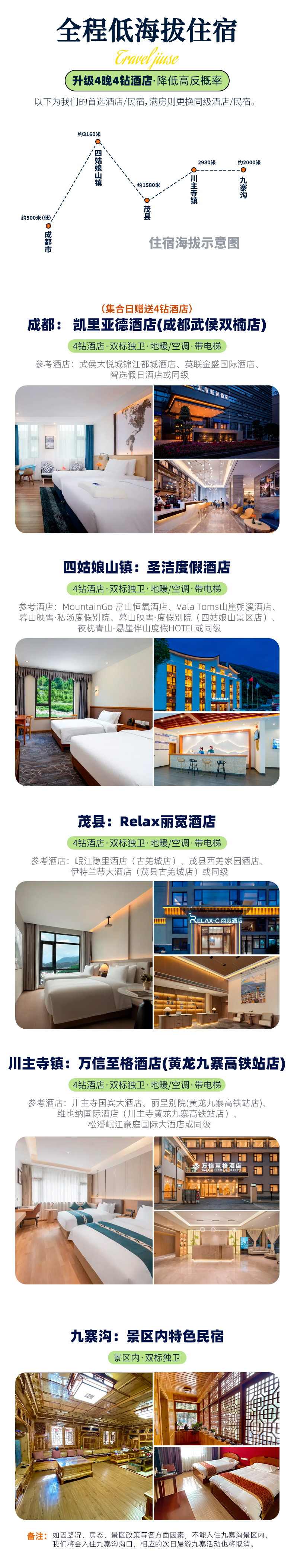2、住宿:全程5晚标间住宿(升级4晚4钻酒店+1晚景区内民宿,含集合日1晚赠送酒店、不住不退);