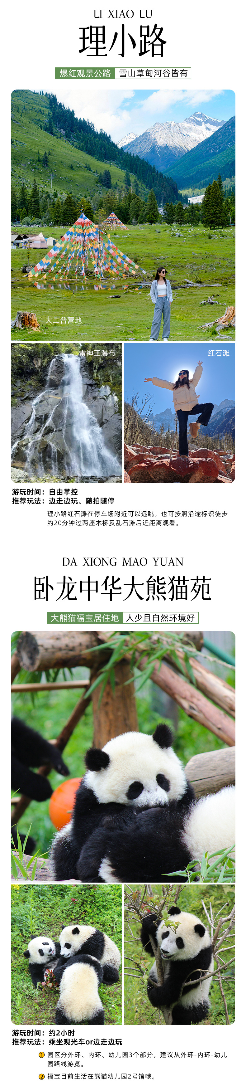 D2:成都-卧龙中华大熊猫苑-猫鼻梁观景台-四姑娘山镇 全天 早晨从成都酒店出发,途经都江堰市、紫坪埔水利工程,沿都汶高速抵映秀,车览地震遗址,感悟大自然的力量,接着前往【卧龙中华大熊猫苑】游玩,这里的自然环境得天独厚,人流量相对较少,熊猫的园舍比较集中,看熊猫的视野更佳,有的在带娃、有的挂在树上,有的趴在爬爬架上,有幸还可遇见奶爸奶妈们喂食,这里也是旅韩归国大熊猫“福宝”的居住地哦!游览完后继续行车,欣赏一路的峡谷风光,而后穿越【巴郎山】,不同季节可观云海、映山红、红白杜鹃花、松萝、高山草甸等,随后在【猫鼻梁观景台】拍【四姑娘山】全景,游玩后前往四姑娘山镇入住。