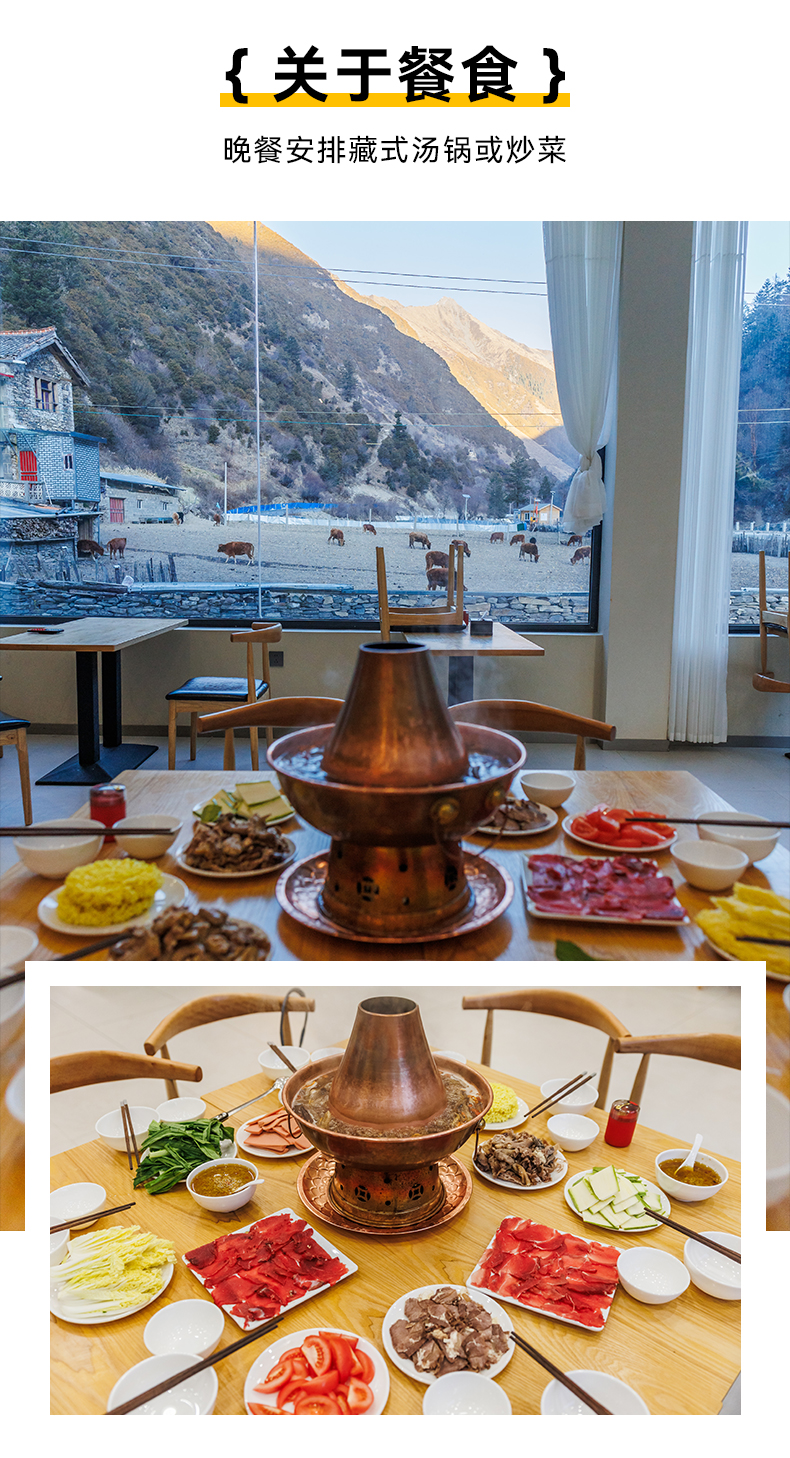 3.餐食:全程所列餐食合计1正1早,包含藏家晚餐、早餐,晚餐为藏式汤锅或炒菜,早餐为粥、大饼、榨菜、清炒蔬菜等。