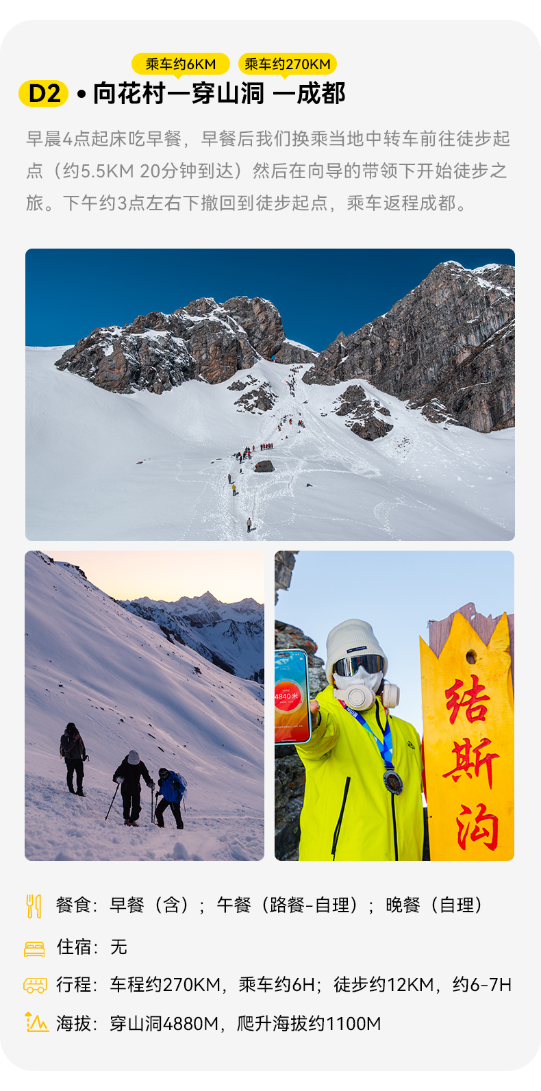 D2:向花村-穿山洞-成都全天 早晨4点起床吃早餐,早餐后我们换乘当地中转车前往徒步起点 (约5.5KM,20分钟到达) 然后在向导的带领下开始徒步之旅。下午约3点左右下撤回到徒步起点,乘车返程成都。