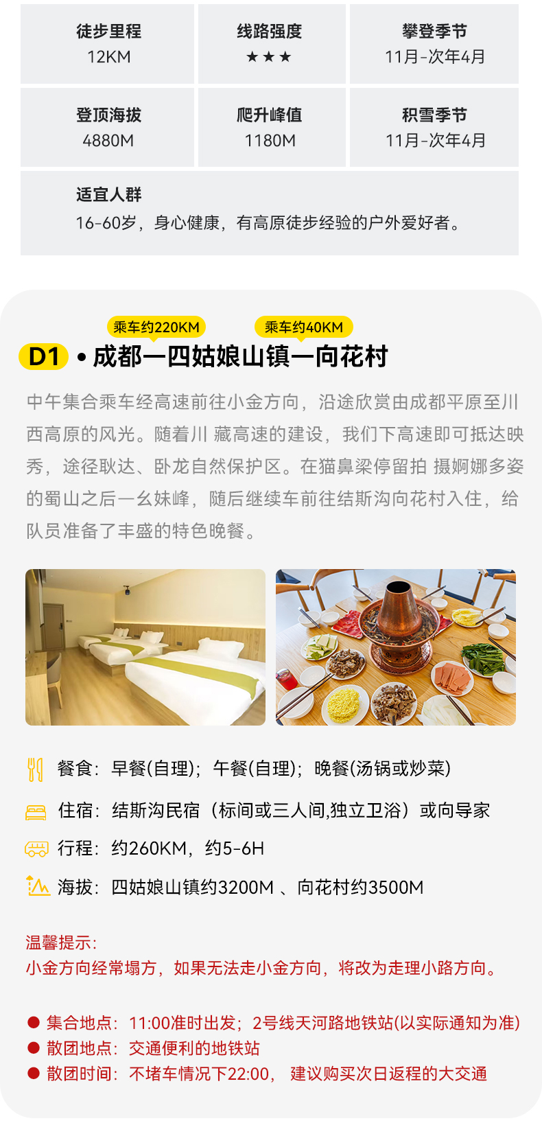 D1:成都-四姑娘山镇-向花村全天 11:00成都地铁2号线天河路集合出发(以实际通知为准) 经高速前往小金方向,沿途欣赏由成都平原至川西高原的风光。随着川藏高速的建设,我们下高速即可抵达映秀,途径耿达、卧龙自然保护区。在猫鼻梁停留拍摄婀娜多姿的蜀山之后一幺妹峰,随后继续车前往结斯沟向花村入住,给队员准备了丰盛的特色晚餐。