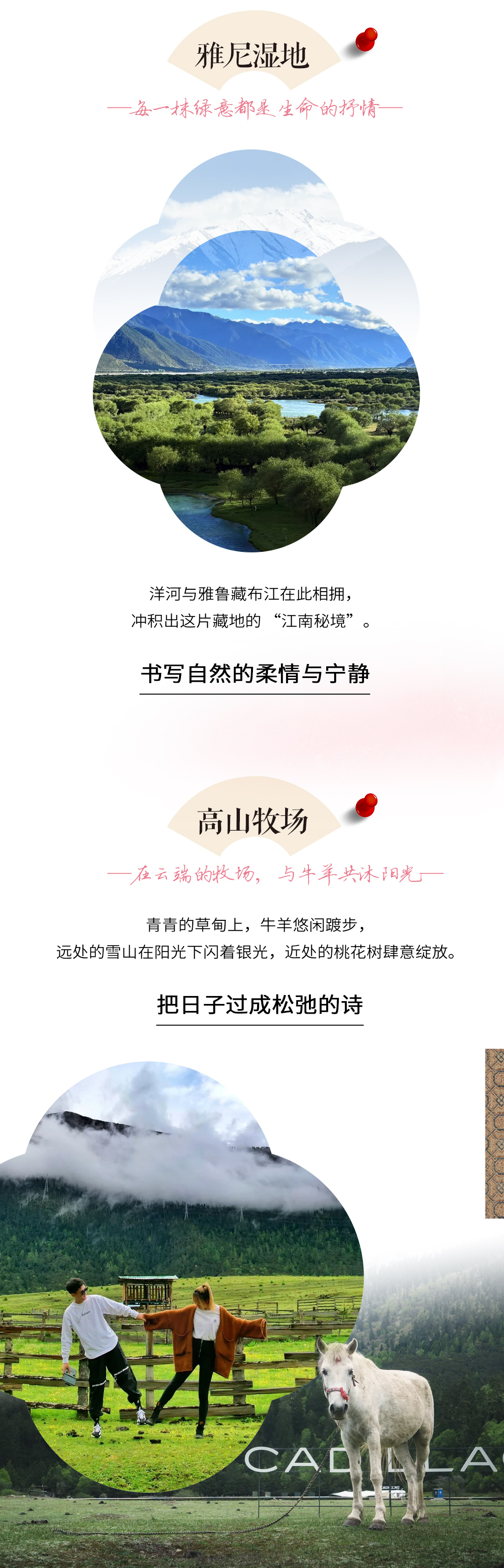 D2:索松村—远观南迦巴瓦峰—雅尼湿地—色季拉山—高山牧场(高山下午茶)—扎塘鲁措(休闲漫步)—鲁朗小镇全天 索松村无论是傍晚还是清晨,落差5000米直观南迦巴瓦的磅礴霸气会让你毛孔顿开。村子的对面就是被誉为“中国最美十大名山”之首的南迦巴瓦,因此索松村也是观赏南迦巴瓦的绝好地点 两江交汇带来大量泥沙沉淀,于是在河道三角洲形成形态各异的河谷平原,它们被散乱的河水分割包围,既是孤岛,又通过浅浅窄窄的沙堤相连,形成阡陌纵横,牧场交错,树林和草场共生的雅尼湿地,隔着江岸,巍峨的雪山下是离离村落,迎着清冽的江风,吸着清甜的空气,你不由得赞美道:好一个世外桃源! 鲁朗,藏语意为“龙王谷”,也是“叫人不想家”的地方。鲁朗海拔3700米,位于距林芝市政府所在地八一镇80公里左右的川藏路上,是座落在深山老林之中的地方。 高原牧场下午茶: 下午,来到鲁朗牧场,享受着属于自己的休闲时光,四面落地窗观景,身临其境,让自己身处这天然纯洁的林海牧场中。 在雄伟的大自然中,隐藏着一片神秘而壮丽的高山牧场——扎塘鲁措。这里,碧绿的湖面宛如一颗明珠,静静地躺在群山的怀抱中。而扎塘鲁措的吊桥,则是通往这片美丽牧场的最佳起点。