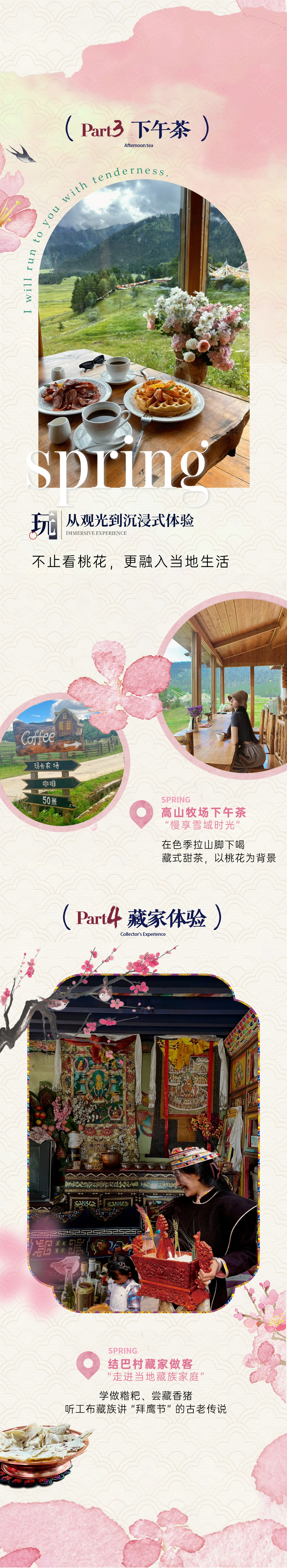D3:鲁朗小镇—古乡湖—波密桃花沟—波密全天 鲁朗用完早餐后前往波密桃花沟,这里的桃树不是人工栽植,都是野生的。几百年来,藏乡人民从没有人破坏和砍伐,这与藏族人喜爱万物生灵有很大的关系。云带挂山腰,雪山影河谷,田地绿色浓,农舍错落间,牛马悠然行,桃花遍地现。这不是文人笔下的仙境,而是人间林芝四月天。