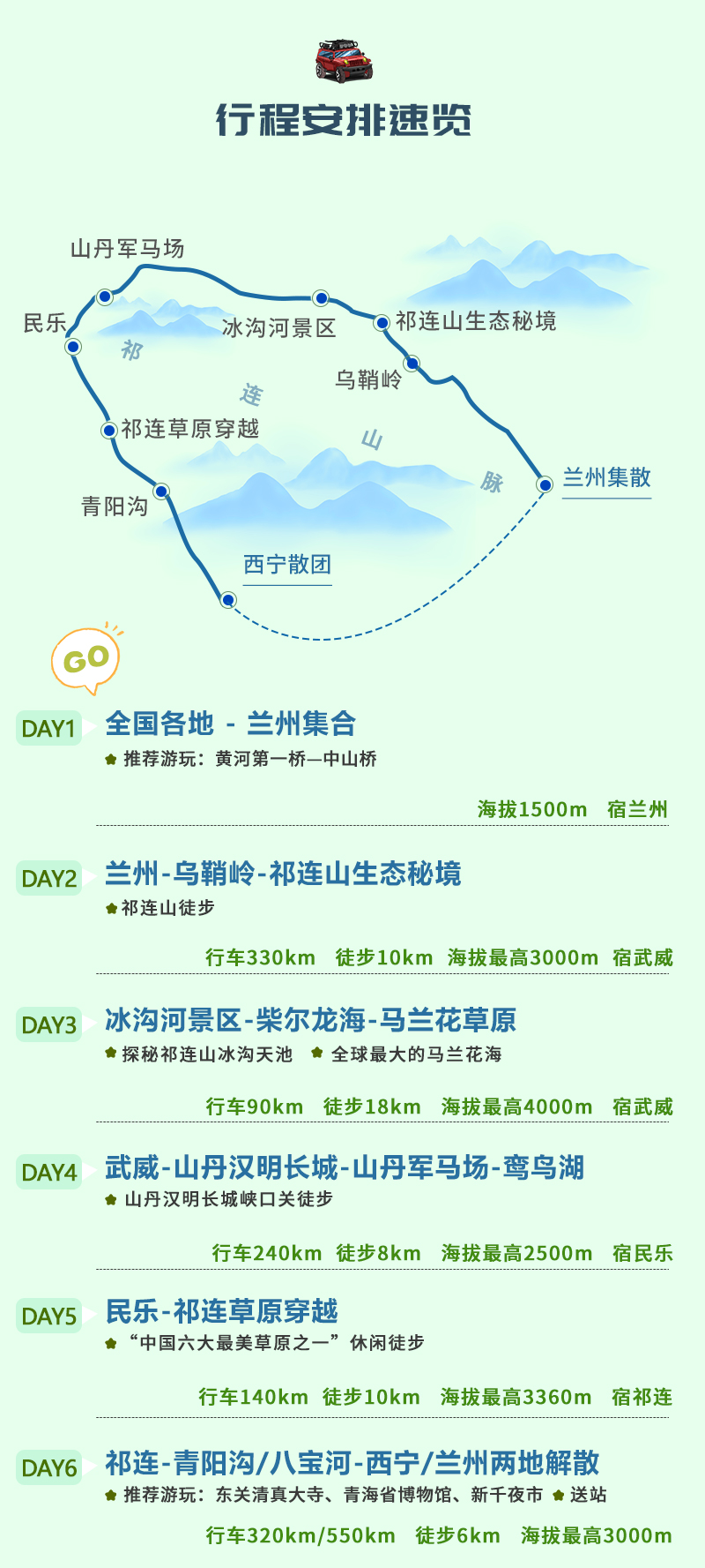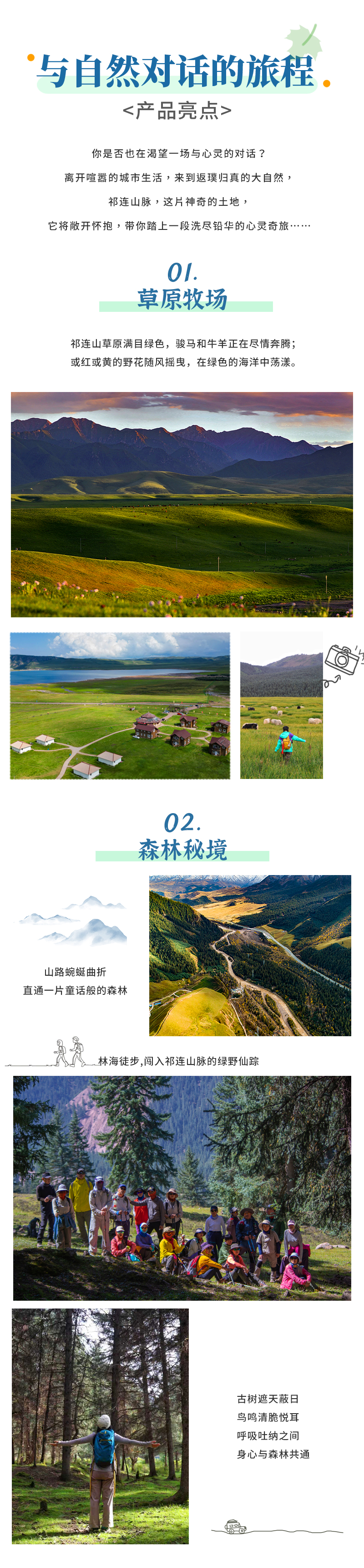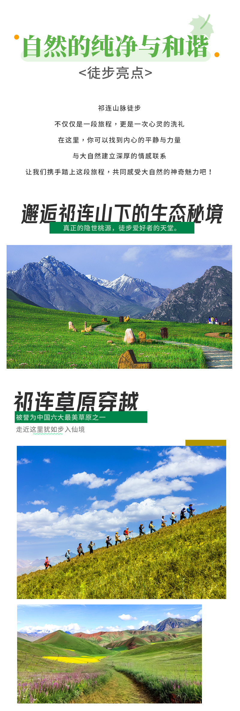 D5:民乐-祁连草原穿越-祁连全天 吃过早饭,开启今天的旅程。祁连山脉连绵起伏,还有广袤的草原风光,是陶冶心灵的绝佳风景区。今天,我们将带领大家徒步穿越【祁连草原】。 沿途河流蜿蜒流淌,映照着万千风景,阳光透过云层,天空湛蓝透明仿佛能摸到它的边缘。远处山峦高耸,像巨人守护一方平安。我们缓缓行走其间,你会找到内心的宁静和前所未有的安全感,人与自然的界限变得模糊。每一位淳朴的牧民,可爱的牛羊,盛开的野花,都能轻易驱散你所有的焦虑和不安,带来洗礼与重生。 当徒步结束,回首祁连山,它伟岸的剪影熠熠生辉,会成为你内心无法忘却的风景。 今晚我们宿在祁连县,累了一天,希望大家做个好梦。