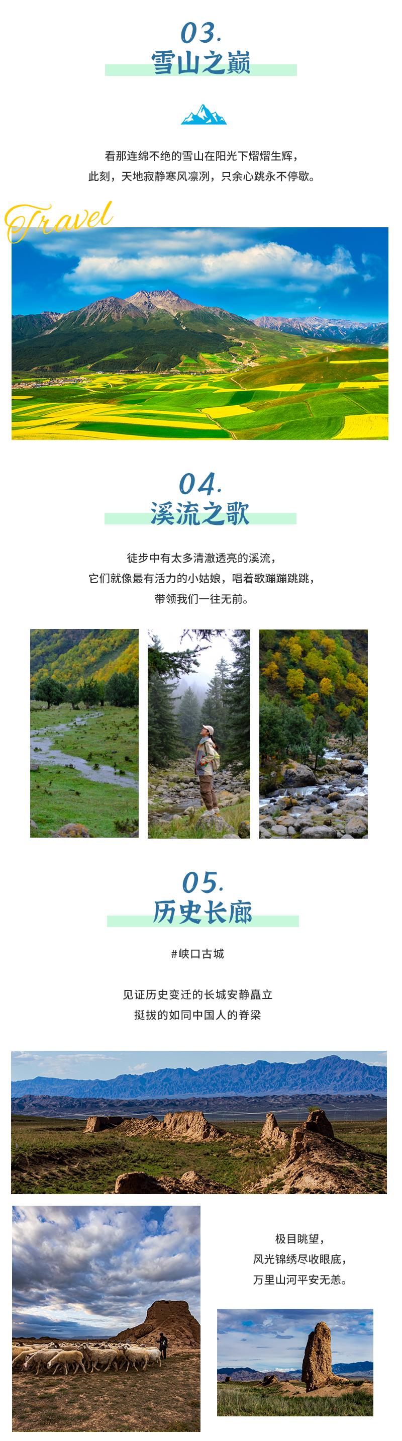 D2:兰州-乌鞘岭-祁连山生态秘境-武威 全天 一想到即将开始的旅程,就连日常的早饭都变得格外有风味。今天,我们将来到地处黄土、青藏、内蒙三大高原交汇地带的【乌鞘岭】。 从张骞出使西域,到玄奘西天取经,这里曾来过壮志未酬的林则徐,也曾站过意气风发的霍去病。乌鞘岭的云烟和雪山交缠,在风的催使下蜿蜒西去,目之所及皆是雄美壮阔。顺着木栈道走上观景台,抬头是“祁连千峰起,雪山万重连”的巍峨,是三大高原交汇处的震撼。吹一吹先辈们曾吹过的风吧,把他们的信念和勇气延续下去。 午后,我们将抵达一个被磨脐山温柔环抱的【藏地秘境】,这里的森林覆盖率高达60%以上,可以尽情呼吸来自海拔2500米以上的纯净空气。沿着步道缓缓上行,这里是一片原生态的秘境,可以远眺祁连山的壮丽景色,继续前进抵达高山草甸区域,夏季时节,这里绿草如茵,野花遍地,犹如天然的锦绣地毯。 稍事休息,我们傍晚入住武威市。