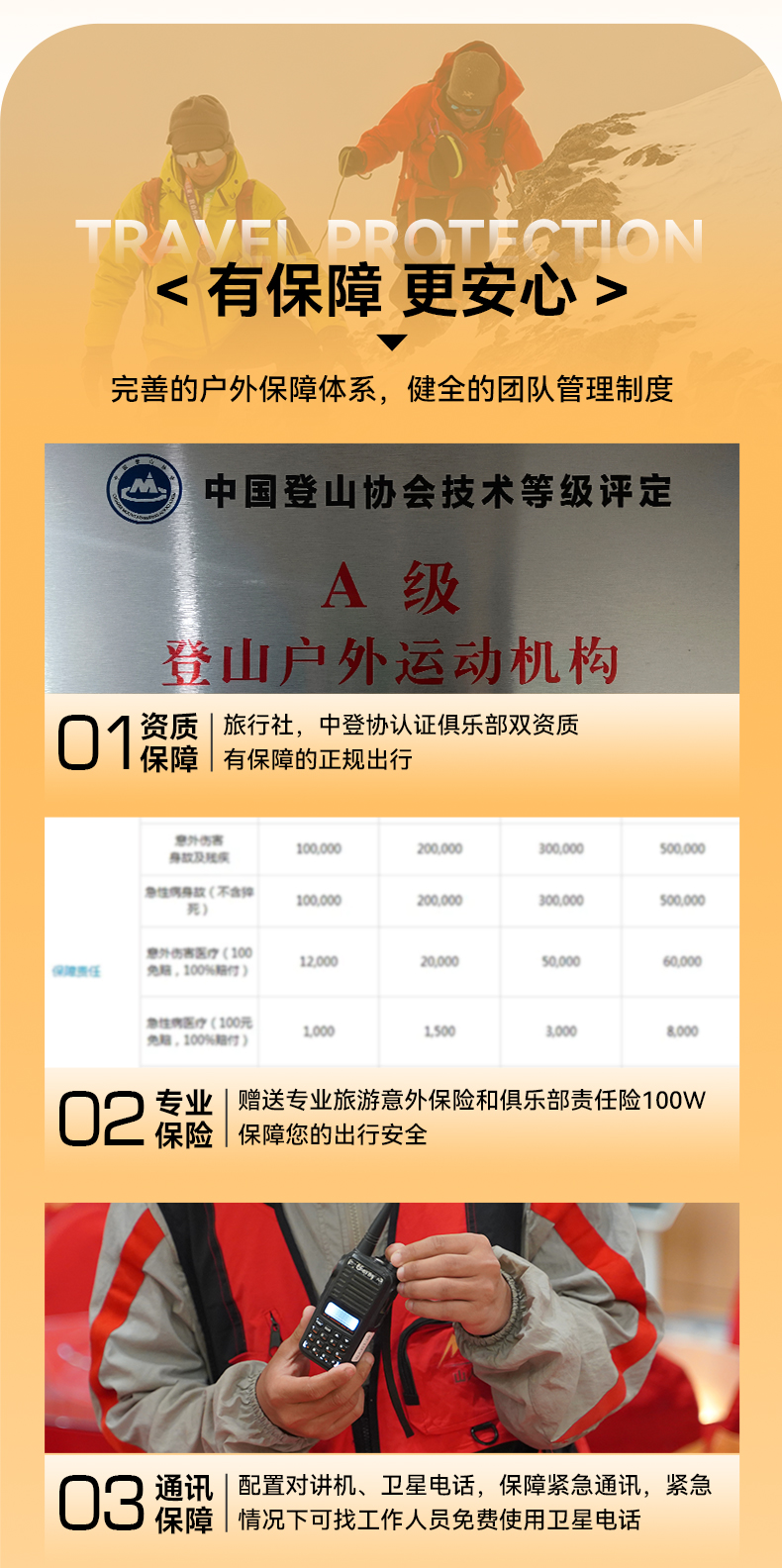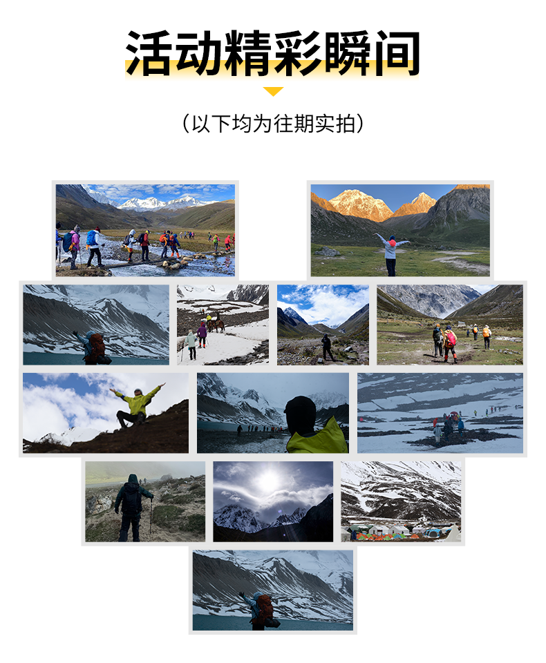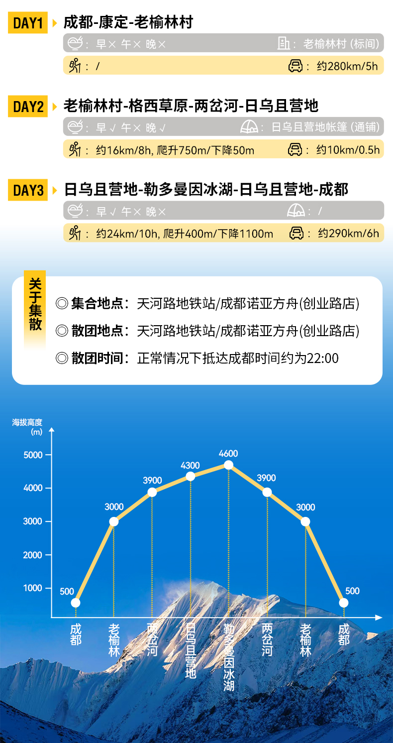 注: 1、行程第三天:上日乌且营地-勒多曼因冰湖-返回营地-老榆林-成都:当天冲顶冰湖后最迟下撤到大本营时间为10点,营地收拾装备后,全员陆续开始下撤下山,到达格西草原安排中转车抵达老榆林客栈,集合当天队员全部到齐可提前出发。 2、返程老榆林回成都最迟出发时间为18点30分,预计凌晨抵达成都,根据当天实时路况为准。 3、当天回成都预定了到外地的大交通机票、火车票的队员,请酌情改期。 4、如行程下山最后设有1名收尾领队,当天某队员下撤时间超过出发时间未能及时下山集合,需签署离团协议书,并自理自行返程回成都的交通车辆费用及陪同领队的返程成本。