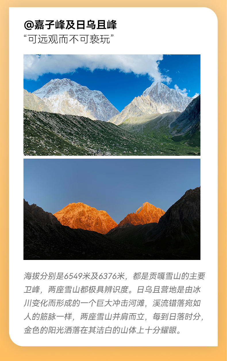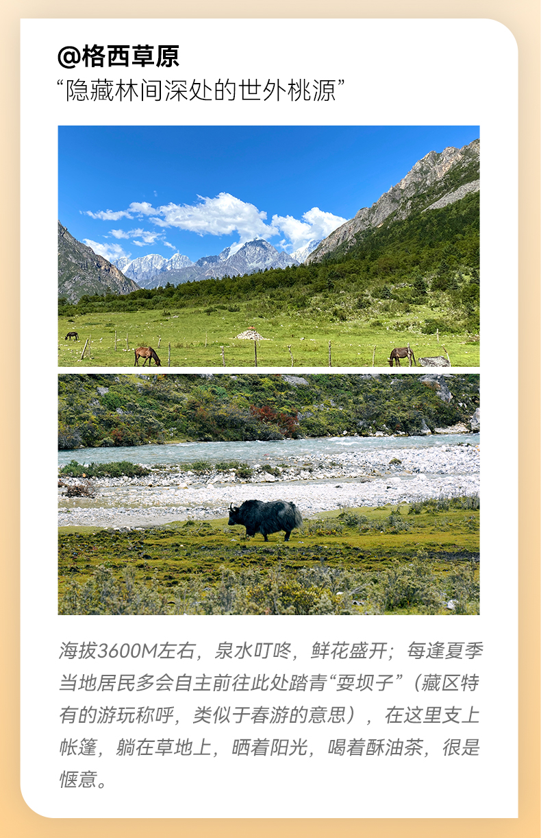 D2:老榆林村 -(乘车约10km/约0.5h)- 格西草原 -(徒步约8km/约4h)- 两岔河 -(徒步约8km/约4h)- 日乌且营地全天 早餐后向日乌且营地方向进发,沿途欣赏壮美的高原风光,中午到达两岔河,河对岸隐约出现大面积红石滩,领队带领大家稍微驻足拍照。一路向南,沿途欣赏田海子雪山(海拔6070M)、小贡嘎(海拔5928M)、嘉子峰(海拔6549M),下午抵达上日乌且扎营。